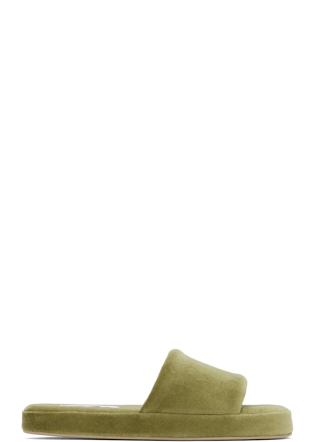 Velvet slippers in khaki. · Open toe · Logo patch at padded footbed · Rubber sole Supplier color: Sage green Upper: textile. Sole: rubber. Made in Italy 251359F124007