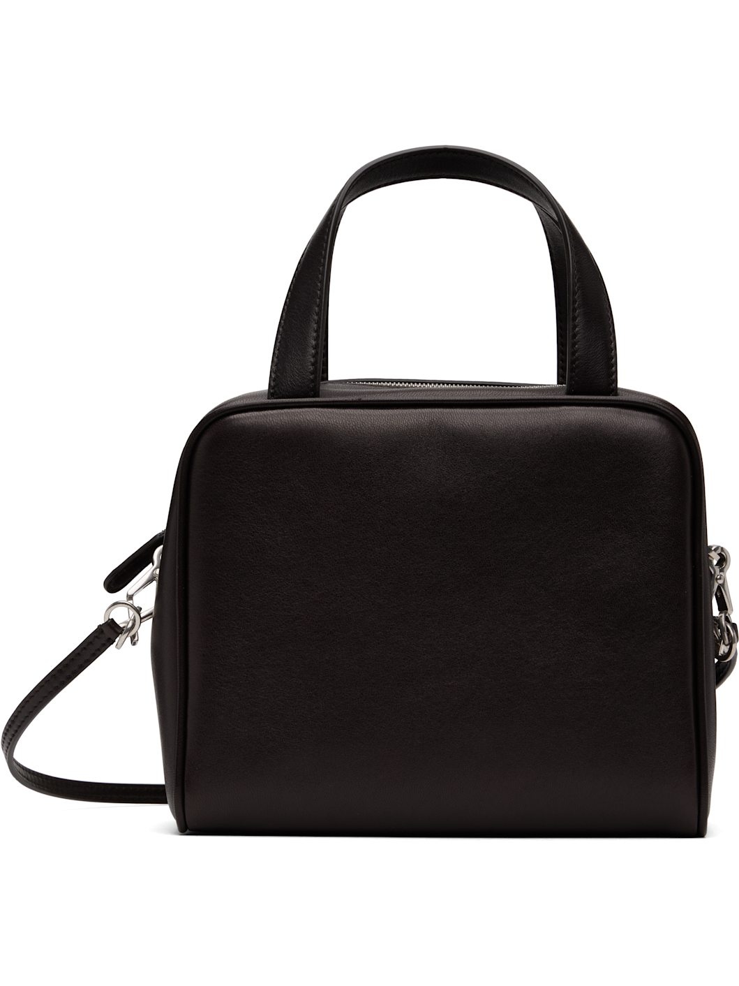 Grained sheepskin top handle bag in brown. · Fixed twin carry handles · Detachable shoulder strap · Logo embossed at side · Zip closure · Card slot at interior · Grained sheepskin lining · Silver-tone hardware · H6" x W7.5" x D4" Supplier color: Dark aniline Sheepskin. Made in Italy 251359F046033