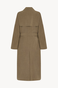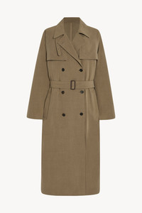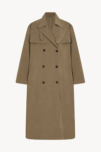 Oversized double-breasted trench coat in refined silk and wool suiting with slant welt pockets, horn button closure, and removable buckle belt. More information - Interior phone compartment - 50% Wool, 50% Silk - Lined in 55% Silk, 45% Cashmere - Made in Italy - Style: 10228W4063BEG