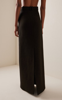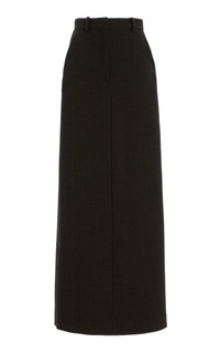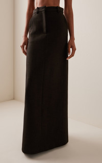 With a focus on exceptional fabrics, impeccable details and uncompromising quality, The Row explores the strength of simplistic shapes, resulting in timeless staples with subtle irreverence. The 'Roux' is a tailored maxi crafted from sleek sateen suiting with a tailored waistband, side seam pockets, and center back vent. PRODUCT DETAILS - Resort '25 - Concealed zip and hook fastening - Composition: 35% Viscose, 35% Cotton, 23% Virgin Sheep Wool, 6% Polyester, 1% Elastane; Combo: 100% Silk - Designer color: Mud - Dry clean only - Imported SIZE & FIT - Our model is wearing a size US 2 - Model is 5'10" with a 30" bust, 24" waist, and 34" hip - Designed for a slim fit