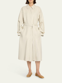 THE ROW "Ryota" trench coat in a smooth leather Point collar; single-breasted front Long raglan sleeves; button-tab cuffs Self-tie cinched waist Hip welt pockets A-line silhouette Hem falls below the knee Back inverted back Concealed button closure Leather Made in Italy Online Inquiries: BGS21_BA3B1| Store Inquiries: #5024377