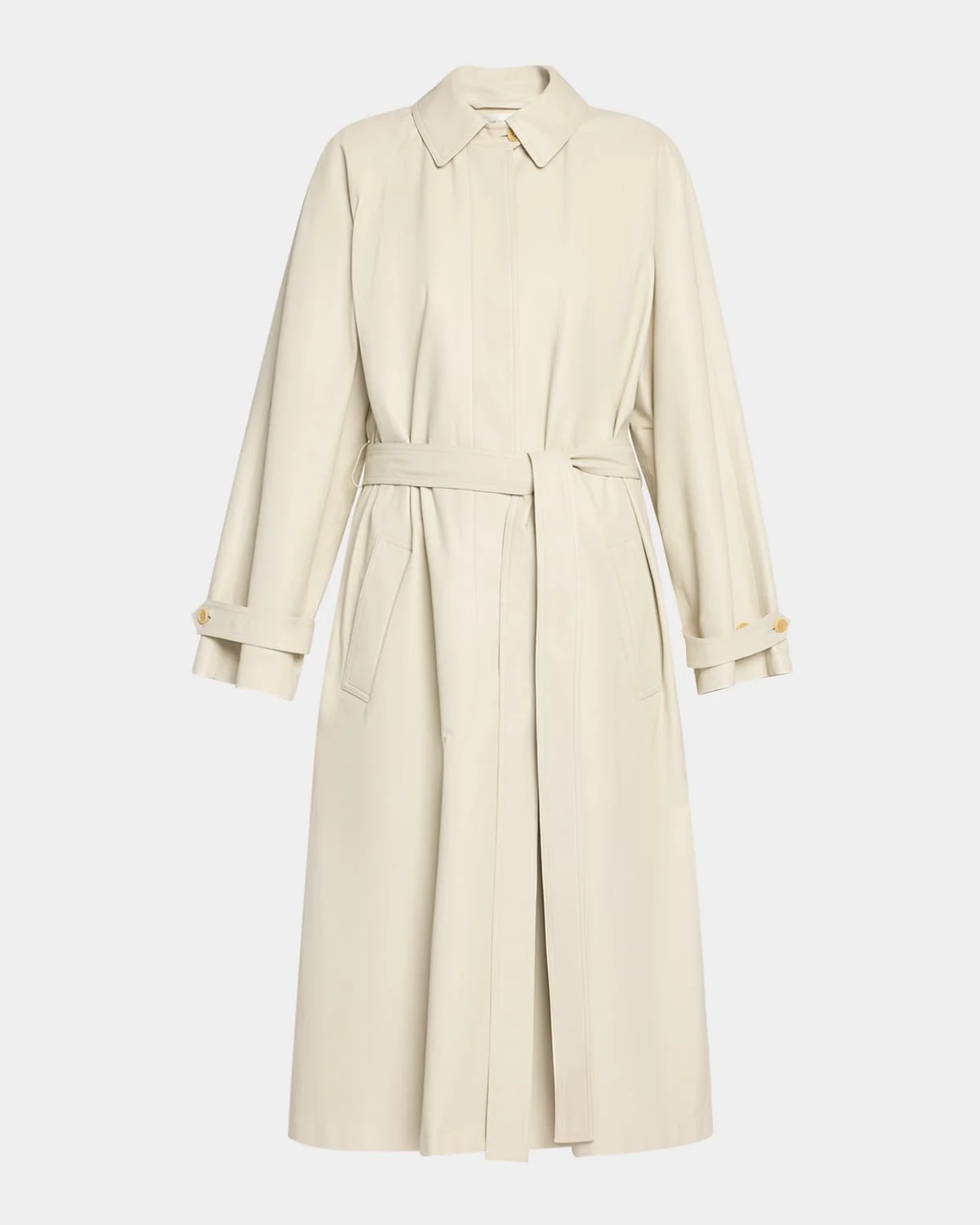 - THE ROW "Ryota" trench coat in a smooth leather - Point collar; single-breasted front - Long raglan sleeves; button-tab cuffs - Self-tie cinched waist - Hip welt pockets - A-line silhouette - Hem falls below the knee - Back inverted back - Concealed button closure - Leather - Made in Italy