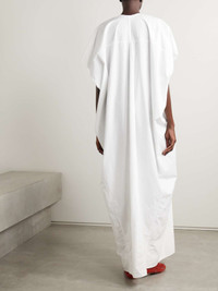 EDITORS'NOTES Comfortable and breezy, The Row's 'Saule' maxi dress is perfect for warm days in the city or on vacation. It's made from wool and silk-blend in a loose, kaftan-inspired shape with generous sleeves and a floor-grazing hem. SIZE & FIT - Fits true to size, take your normal size - Intended for a loose fit - Lightweight, non-stretchy fabric - Model is 180cm/ 5’11” and is wearing a size Small DETAILS & CARE - White wool and silk-blend - Button fastening at front - 85% wool, 15% silk; lining: 100% silk - Mother-of-pearl: Australia