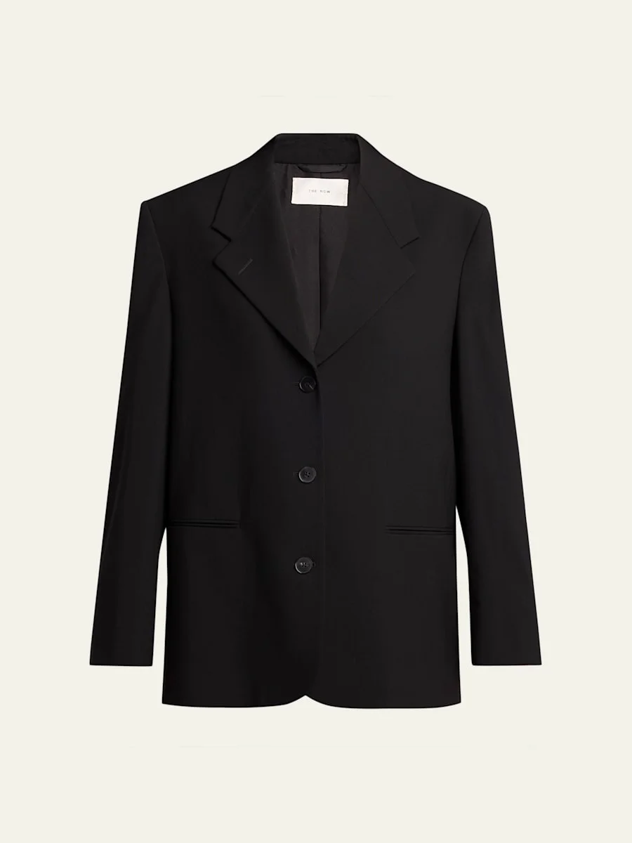 THE ROW "Selim" blazer jacket is tailored in a wool-silk crepe with structured shoulders Notch lapels; single-breasted front Long sleeves; button cuffs Padded shoulders Hip double welt pockets Oversized fit Hem falls below the hip Wool/silk Made in Italy Online Inquiries: BGS21_BB2XJ| Store Inquiries: #5470486