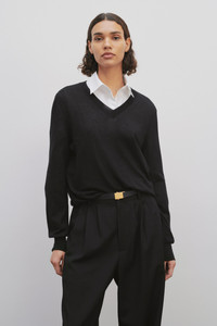 The Row Essentials v-neck sweater in superfine cashmere knit with finely ribbed neckline, cuffs and hem. More information - Signature stitching along the back - 100% Cashmere - Made in Italy - Style: 5581Y498BLK