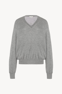 The Row Essentials v-neck sweater in superfine cashmere knit with finely ribbed neckline, cuffs and hem. More information - Signature stitching along the back - 100% Cashmere - Made in Italy - Style: 5581Y498MEG