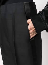 straight-leg tailored trousers Highlights - Black - Virgin wool-silk blend/cotton - Side stripe detailing - Tailored design - Straight leg - Mid-rise - Concealed front fastening - Two side slit pockets - Two rear welt pockets - Pressed crease Made in Italy Composition Outer: Cow Horn 100%, Virgin Wool 82%, Silk 18% Lining: Cotton 100% SIZE & FIT Model measurements Height 5 ft 10 in(1.78 m) Bust/Chest 31.49 in(80 cm) Hips 36.22 in(92 cm) Waist 25.59 in(65 cm) FittingInformation Designed for a straight-leg fit, these trousers allow for a close fit at the waist and an unrestricted, comfortable fit over the leg Made from a midweight non-stretch fabric This piece fits true to size – take your usual size Washing instructions Dry Clean Only
