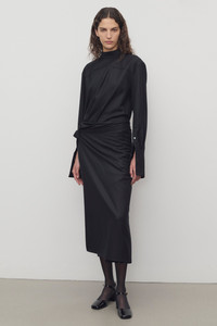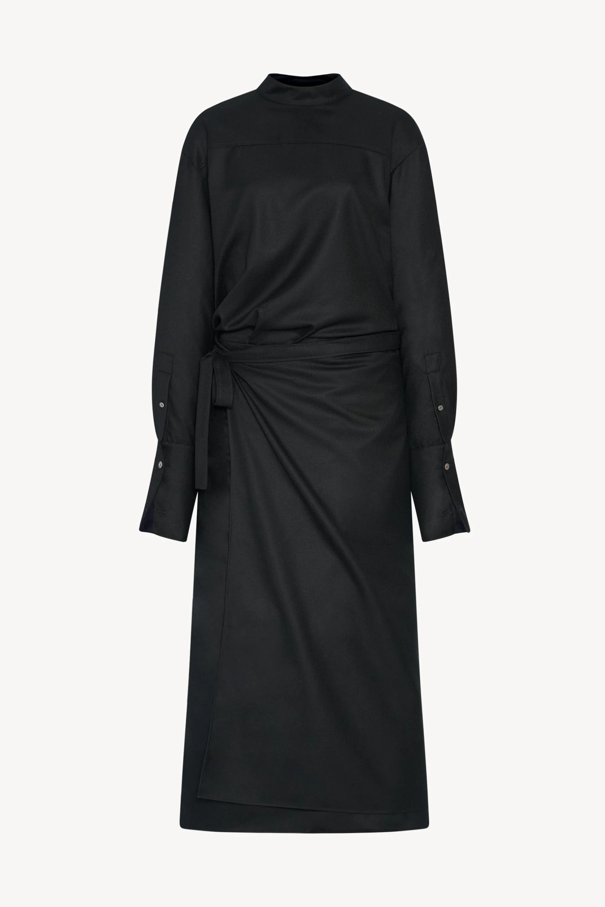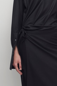 Sculptural ankle-length shirtdress in virgin wool flannel with high neckline, wrapped panel at waist with ties, and elongated shirt cuffs. More information - 100% Wool - Lined in 100% Silk - Made in Italy - Style: 10244W4084BLK