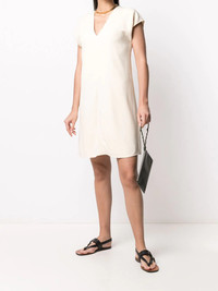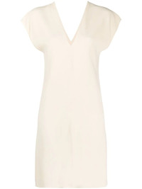 V-neck shift dress Highlights - Vanilla cream - Silk - V-neck - V-back - Cap sleeves - Loose fit - Thigh-length - Straight hem Made in United States Composition Lining: Silk 100% Outer: Viscose 64%, Acetate 33%, Elastane 3% SIZE & FIT Model measurements Height 5 ft 10 in(1.78 m) Bust/Chest 33.07 in(84 cm) Hips 35.82 in(91 cm) Waist 25.98 in(66 cm) Washing instructions Dry Clean Only