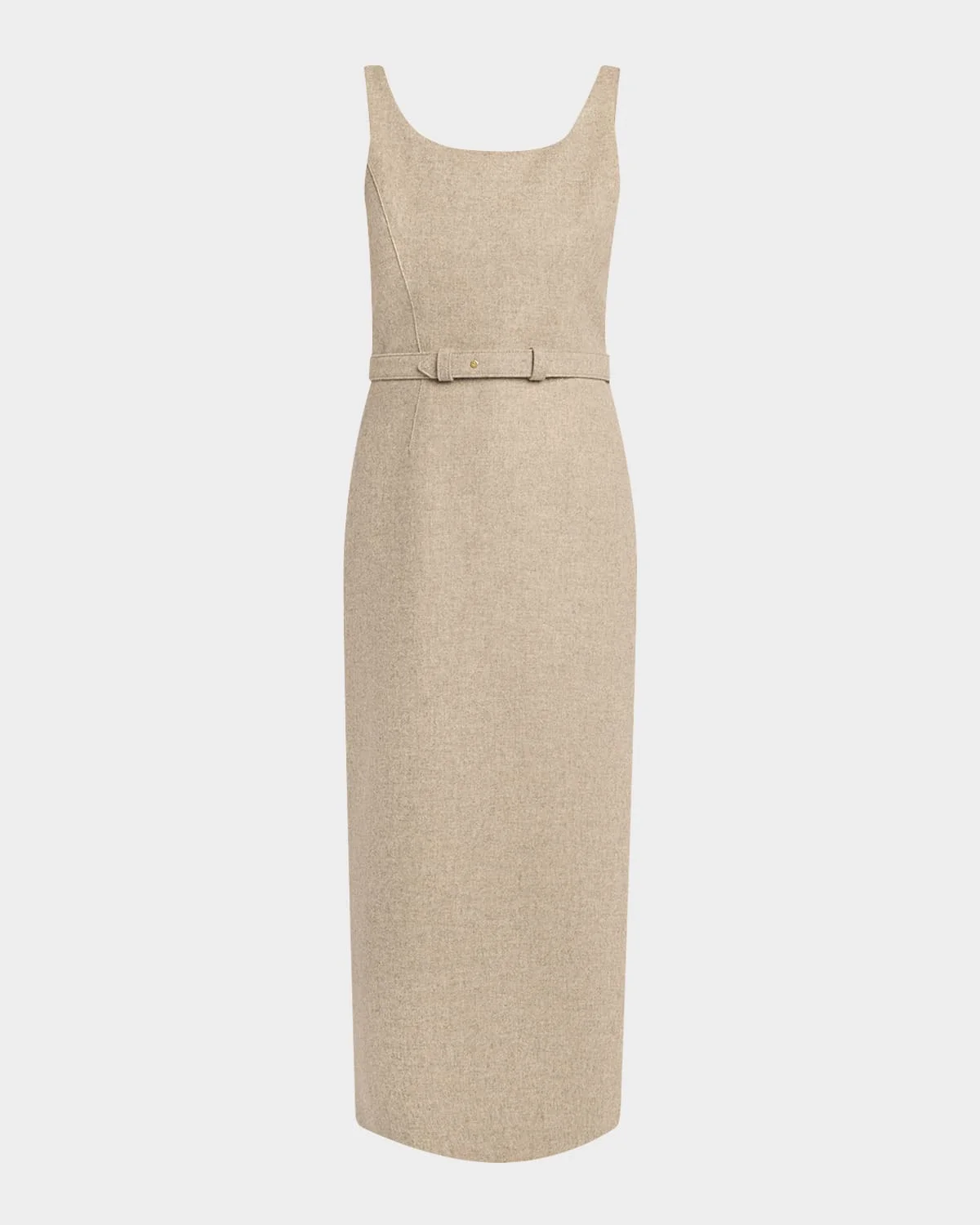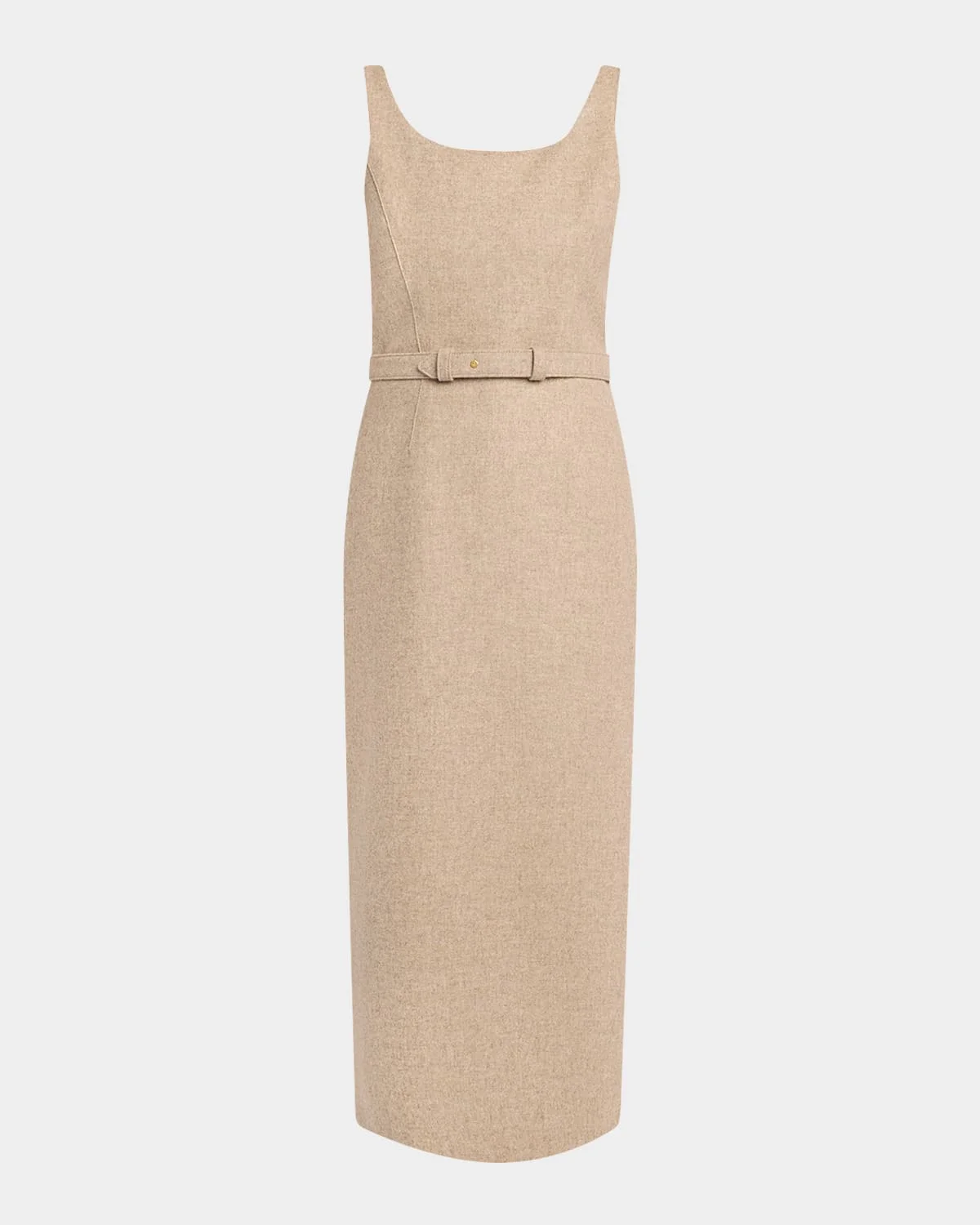 THE ROW "Vadira" dress is crafted of a brushed wool and is cinched at the waist with a self belt Scoop neckline Sleeveless Sheath silhouette Hem falls below the knee Walking vent back Wool/silk Made in Italy