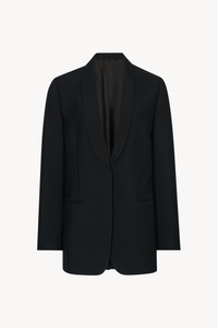 Single-breasted tuxedo jacket in fluid virgin wool with shawl lapel, front welt pockets, and interior satin ribbon closure. More information - 100% Wool - Lined in 100% Silk - Made in Italy - Style: 10135W2833BLK