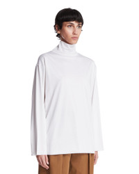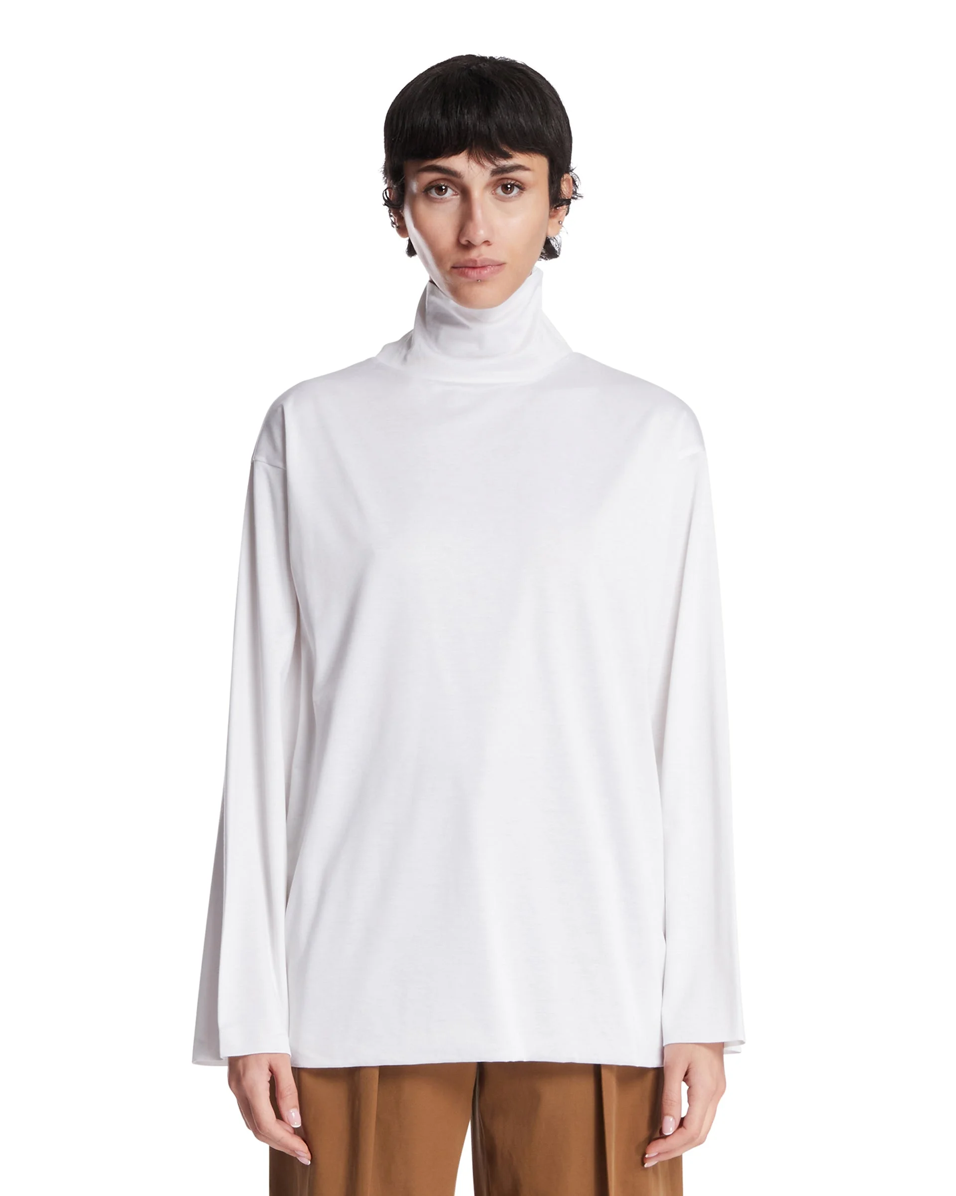 The Row White Silk and Cotton Top. White cotton blend and silk, long sleeves, high neck, dropped shoulders, straight hem. Relaxed fit. Anis is 178 cm and she is wearing size S. DETAILS Model: 10452K704WHT Composition: 62% Silk, 38% Cotton Made in: ITALY Season: FW25-26
