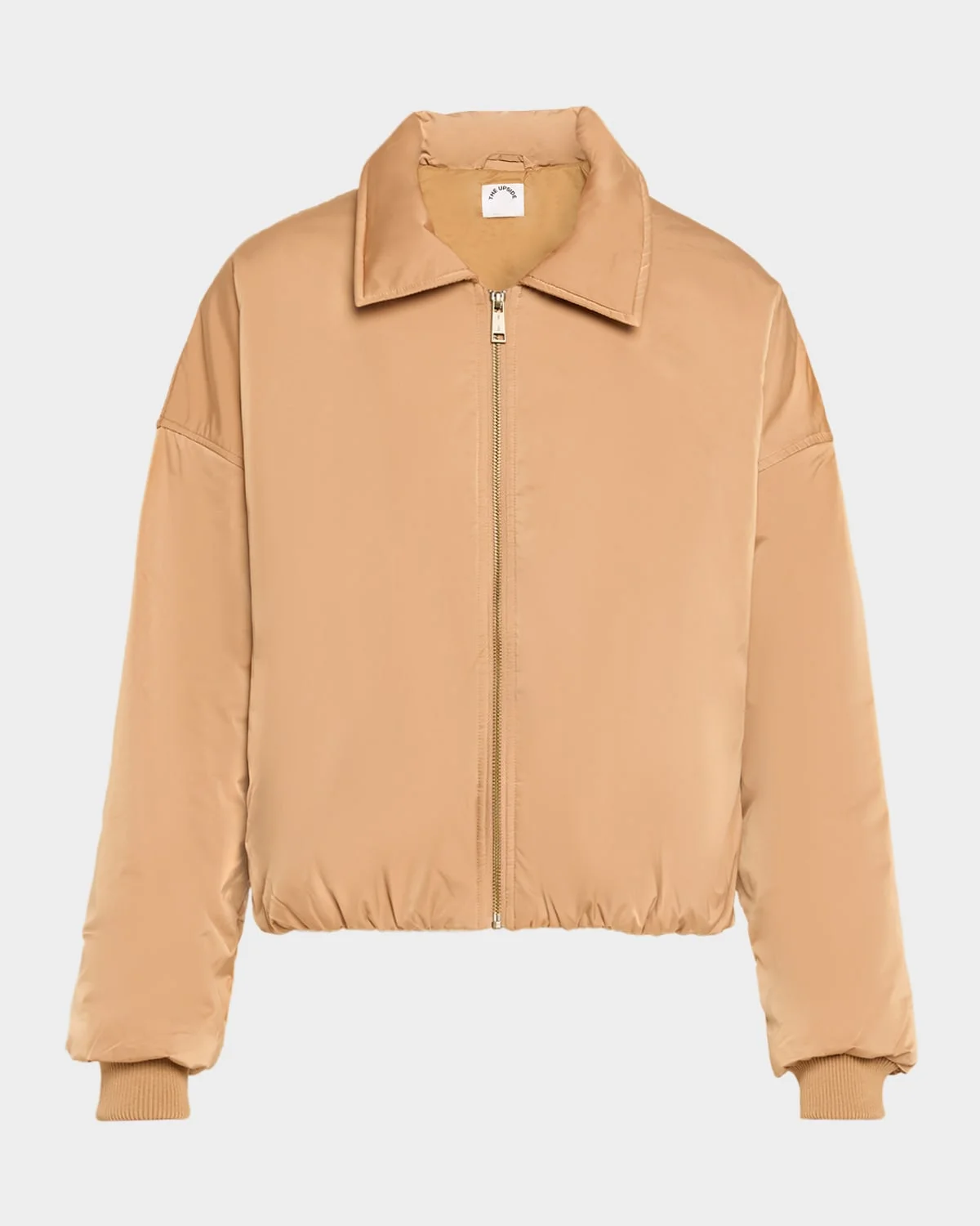 The "Carlotta" jacket by The Upside is designed in a classic bomber silhouette, complete with ribbed cuffs and hem for an adjustable fit Approx. 32"L from shoulder to hem Spread collar; zip front Dropped shoulders Long sleeves; approx. 22"L Side seam pockets Hip length Polyester Dry clean only Imported
