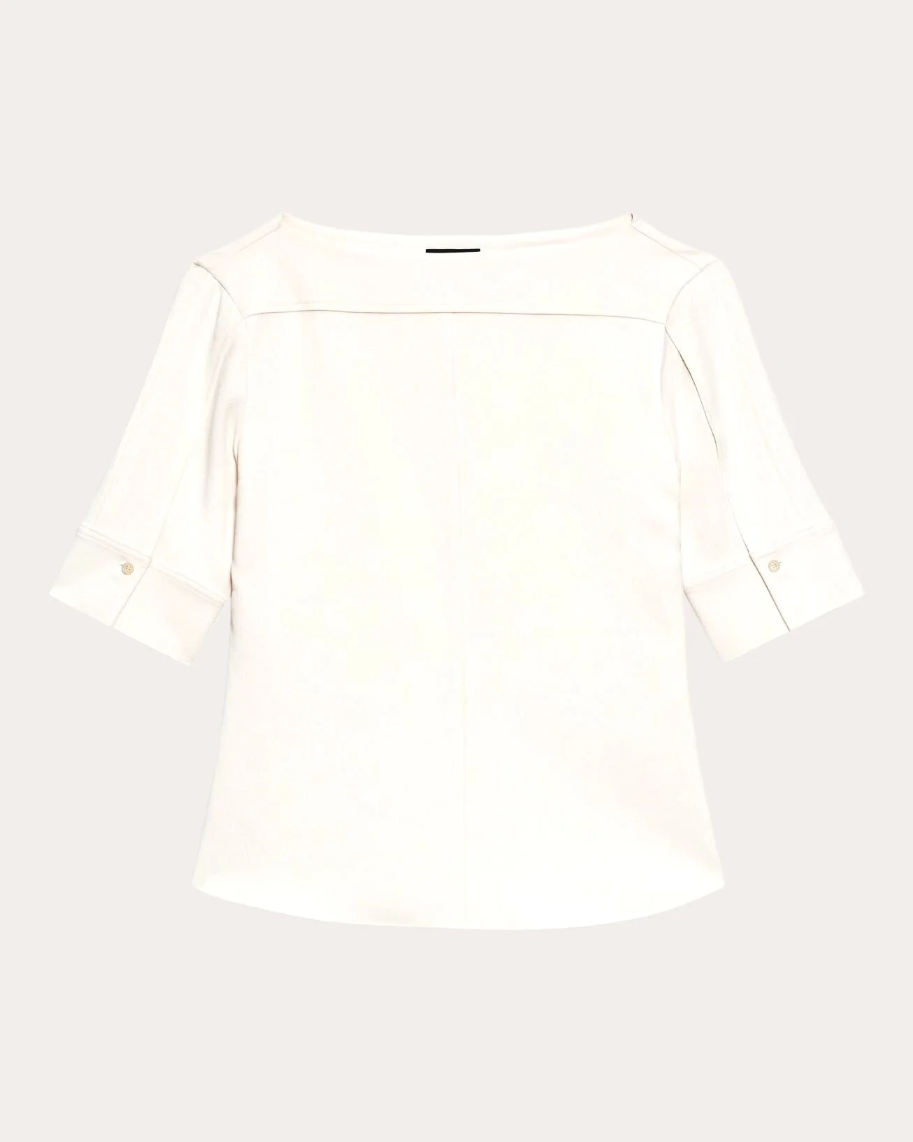 Cut for an effortlessly polished drape, this boatneck top is crafted from Theory's signature admiral crepe fabric. The seamed elbow-length sleeves feature slit details that can be buttoned at the cuffs or left to flutter open. Designer color: rice Pull-on Seamed details Slit sleeves with button cuffs Admiral crepe 70% triacetate, 30% polyester Dry clean Made in Vietnam Size & Fit Garment measurements (size S): 21.75in long from high point of shoulder to hem, 37.6in bust Fits true to size Please note, below measurements reflect Theory's size chart, not the actual garment. Size P (XS): 31-32in bust, 24.5-25.5in waist, 34.25-35.25in hips Size S: 33-34in bust, 26.5-27.5in waist, 36.25-37.25in hips Size M: 35-36in bust, 28.5-29.5in waist, 38.25-39.25in hips Size L: 37.5-39in bust, 31-32.5in waist, 40.75-42.25in hips Size XL: 40.5-42in bust, 34-35.5in waist, 43.75-45.25in hips