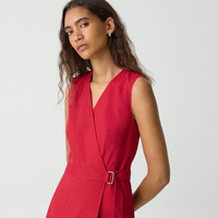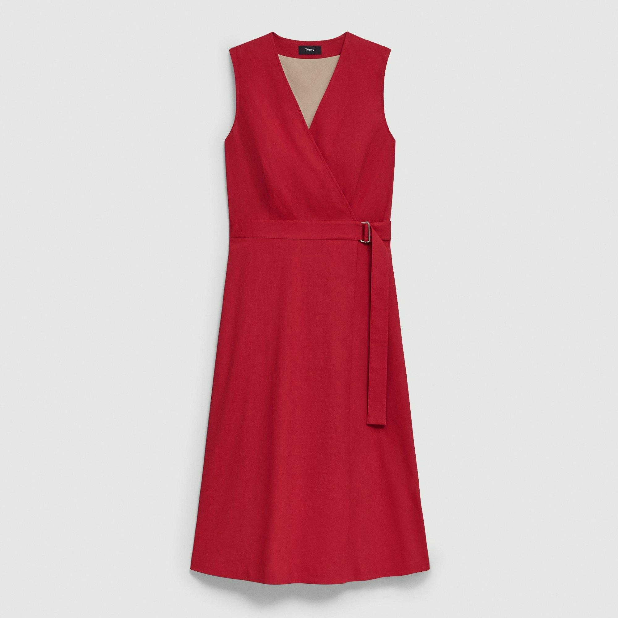 Please enter your email below to be notified when this item is in stock Wrapped at the waist to accentuate its relaxed, A-line silhouette, our wrap dress features a V-neckline and curved hem. Crafted from our signature stretch Good Linen fabric, this sleeveless style is a warm-weather everyday favorite. Theory for Good Woven by the Marini & Cecconi Mill in Prato, Italy, Good Linen is our signature stretch linen fabric, made up of three fibers— flax sourced from France, viscose made from repurposed cotton fiber waste, and certified recycled elastane for stretch. Learn more about our Good Linen. Style #: P0303606 Please enter your email below to be notified when this item is in stock Fit True to size, choose your normal size A-line silhouette, sleeveless Below-the-knee length Model is 5’11” and wearing a US size 2 Materials & Care Composition 62% linen 36% viscose 2% elastane Care Do not wash. Do not bleach. Do not tumble dry. Cool iron if needed. Dry clean with any solvent except trichloroethylene. Imported