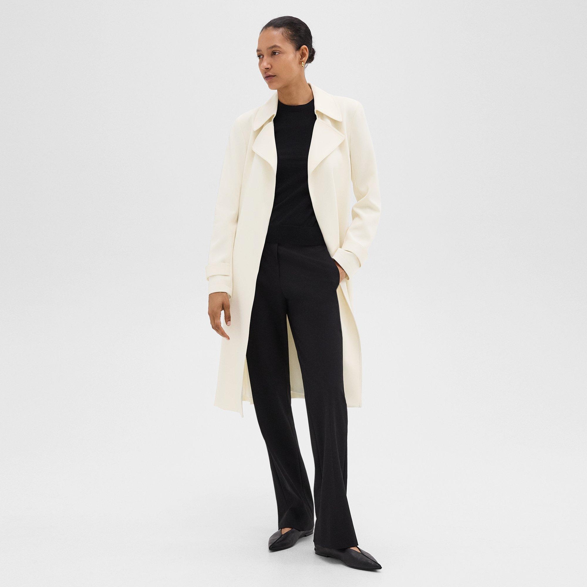 Our minimalist trench coat is a timeless outerwear staple that instantly refines any look. Finished with a waist tie to temper its relaxed silhouette, this fully-lined style is cut from our signature Japanese Admiral Crepe for a softly draped fit that maintains a polished appearance. We are committed to positively impacting the people who wear our clothes, our industry, and our planet, beginning with our fabrics. Our signature crepe is woven with triacetate, a fabric made from acetic acid and wood pulp sourced from certified responsibly managed forests. Style #: J0709411 Fit True to size, choose your normal size Relaxed fit, long sleeves Knee length Model is 5’10” and wearing a US size S Materials & Care Composition 70% triacetate 30% polyester Care Do not wash. Do not bleach. Do not tumble dry. Cool iron if needed. Dry clean with any solvent except trichloroethylene. Imported
