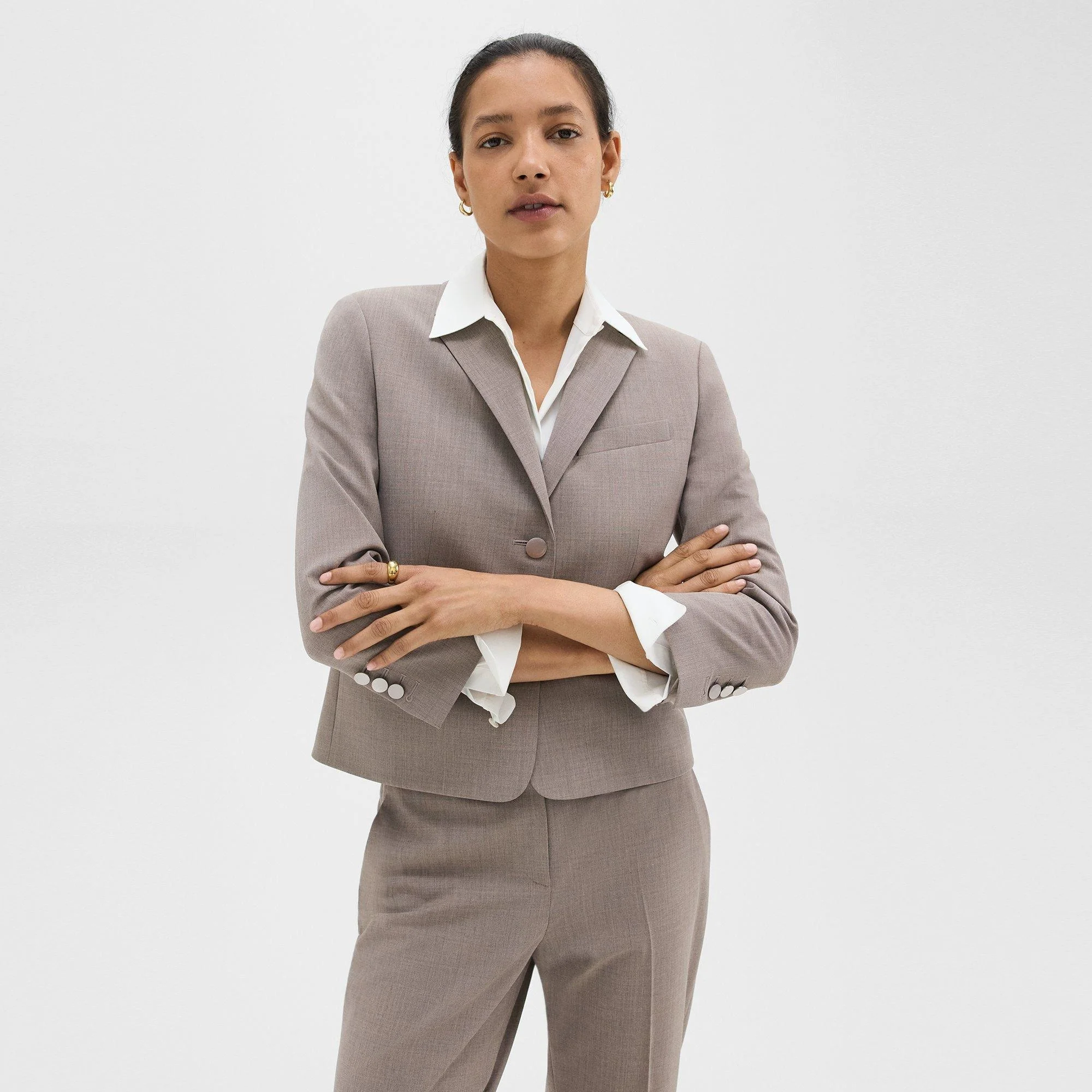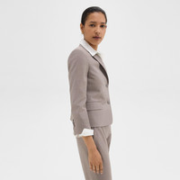 A classic style rooted in traditional tailoring, this blazer is cut for a boxy fit. Punctuated with a pair of button closures, this single-breasted style is crafted with Good Wool with a hint of stretch for a relaxed feel, it’s detailed with notched lapels, and flap pockets. Theory for Good We are committed to making a positive impact on the people who wear our clothes, our industry, and our planet, beginning with our Good fabrics. Consciously manufactured from start to finish, our Good Wool is crafted with premium merino wool. It’s sourced from certified responsibly managed farms in Australia, including the Beaufront farm in Tasmania and woven by the Tollegno 1900 mill in Biella, Italy. Learn more about our Good Wool. Style #: O0701101 Fit True to size, choose your normal size Relaxed fit, long sleeves Hip length Model is 5’11” and wearing a US size 2 Materials & Care Composition 96% wool 4% elastane Care Do not wash. Do not bleach. Do not tumble dry. Cool iron if needed. Dry clean with any solvent except trichloroethylene. Imported