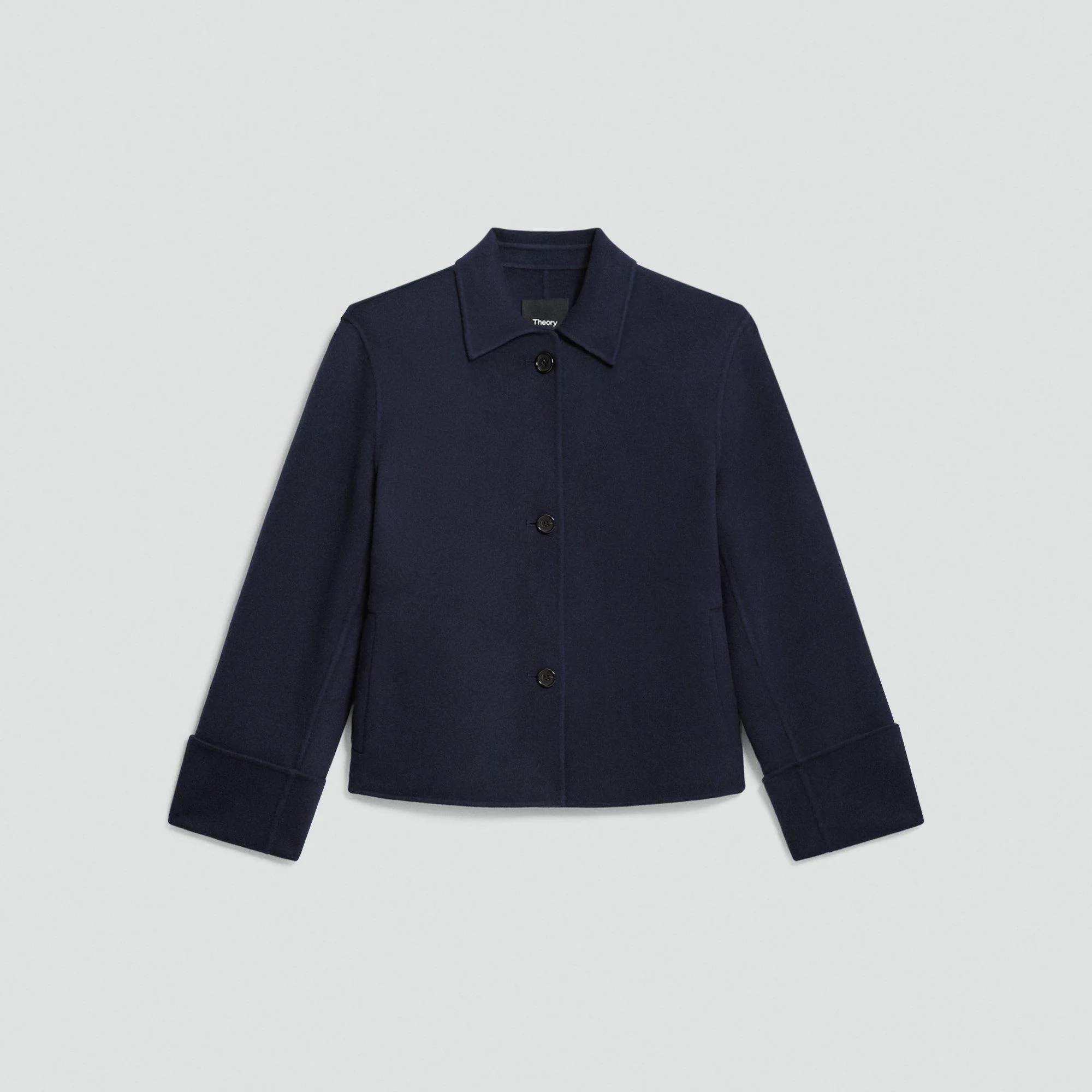 Please enter your email below to be notified when this item is in stock Defined by its cropped boxy shape and exaggerated cuffs, this button-front jacket takes cues from classic tailoring. Double-face fabrics are created through a special weaving process that joins two layers of a material in which the most luxurious sides of the fabric face outward. Due to their unique construction, double-faced garments are seamed together with special techniques that result in a clean, refined finish. This elevated process—along with the fabric's superior warmth—allows the garments to be unlined. This fabric is made in Italy of both pre- and post-consumer certified responsibly sourced wool and recycled cashmere as well as virgin fibers. Style #: P0801107 Please enter your email below to be notified when this item is in stock Fit True to size, choose your normal size Relaxed fit, long sleeves Short length Model is 5’11” and wearing a US size S Materials & Care Composition 90% wool 10% cashmere Care Do not wash. Do not bleach. Do not tumble dry. Cool iron if needed. Dry clean with any solvent except trichloroethylene. Imported