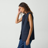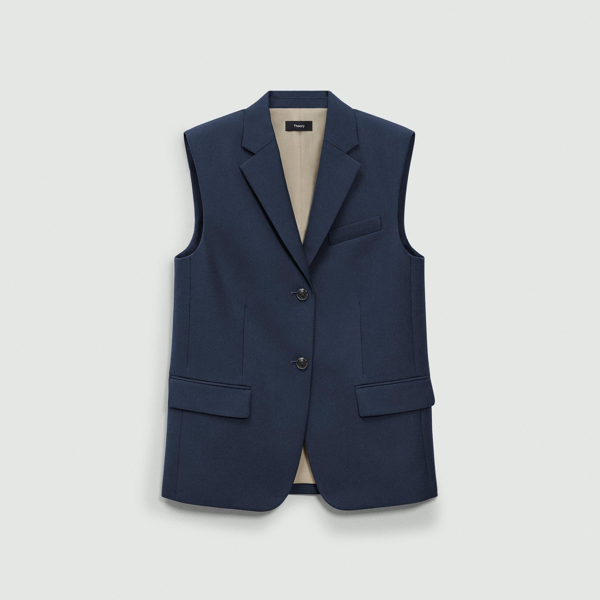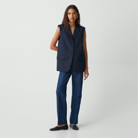 This classic two-button silhouette is detailed with notch lapels and side flap pockets. Cut for an oversized fit, this boxy style can be worn as a layer or on its own. The vest is crafted of a coarse yet soft wool-blend hopsack weave, perfect for the cooler months of spring. The fabric is made from wool sourced from certified responsibly managed farms, blended with certified recycled polyester from post-consumer waste. Style #: P0201101 Fit Runs large, we recommended sizing down for a more tailored fit Oversized fit, sleeveless Hip length Model is 5’11” and wearing a US size 2 Materials & Care Composition 60% wool 40% polyester Care Do not wash. Do not bleach. Do not tumble dry. Cool iron if needed. Dry clean with any solvent except trichloroethylene. Imported
