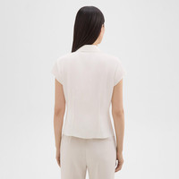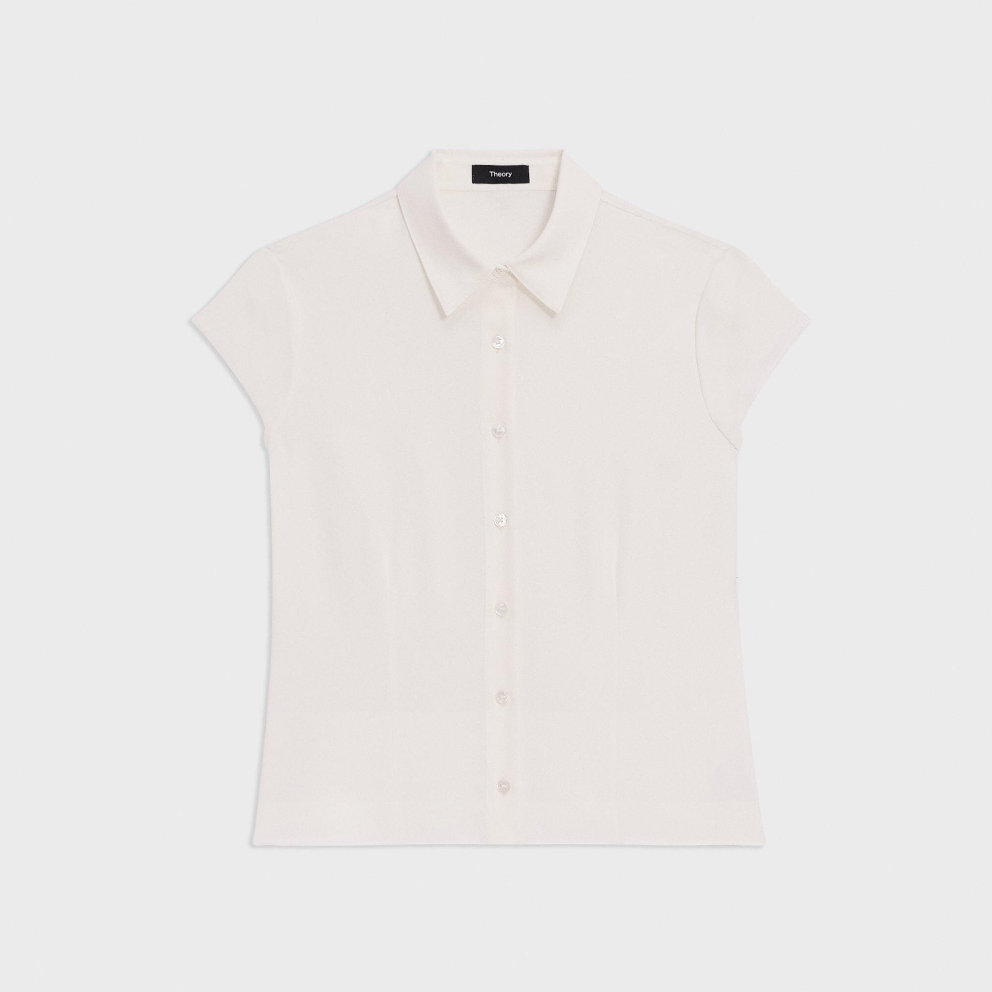 Detailed with a pointed collar, our short is designed with short cap sleeves and button front closures. This slim-fitting style is crafted in a lightweight silk georgette that feels light and airy. Our silk georgette is MADE IN GREEN by OEKO-TEX® certified. All products with this certification are made without harmful chemicals, in environmentally and socially responsible facilities. Each component of the garment, the factory, and the mill have been certified by OEKO-TEX®. Style #: O0102530 Fit True to size, choose your normal size Slim fit, short sleeves Hip length Model is 5’11” and wearing a US size S Materials & Care Composition 100% silk Care Do not wash. Do not bleach. Do not tumble dry. Cool iron if needed. Dry clean with any solvent except trichloroethylene. Imported