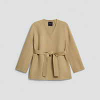 Please enter your email below to be notified when this item is in stock This cardigan-style jacket is designed with a relaxed drape and slightly dropped shoulders. The silhouette is finished with a removable waist tie. Defined by its cropped boxy shape and exaggerated cuffs, this button-front jacket takes cues from classic tailoring. Double-face fabrics are created through a special weaving process that joins two layers of a material in which the most luxurious sides of the fabric face outward. Due to their unique construction, double-faced garments are seamed together with special techniques that result in a clean, refined finish. This elevated process—along with the fabric's superior warmth—allows the garments to be unlined. This fabric is made in Italy of both pre- and post-consumer certified responsibly sourced wool and recycled cashmere as well as virgin fibers. Style #: P0801406 Please enter your email below to be notified when this item is in stock Fit True to size, choose your normal size Relaxed fit, long sleeves Hip length Model is 5’11” and wearing a US size S Materials & Care Composition 90% wool 10% cashmere Care Do not wash. Do not bleach. Do not tumble dry. Cool iron if needed. Dry clean with any solvent except trichloroethylene. Imported