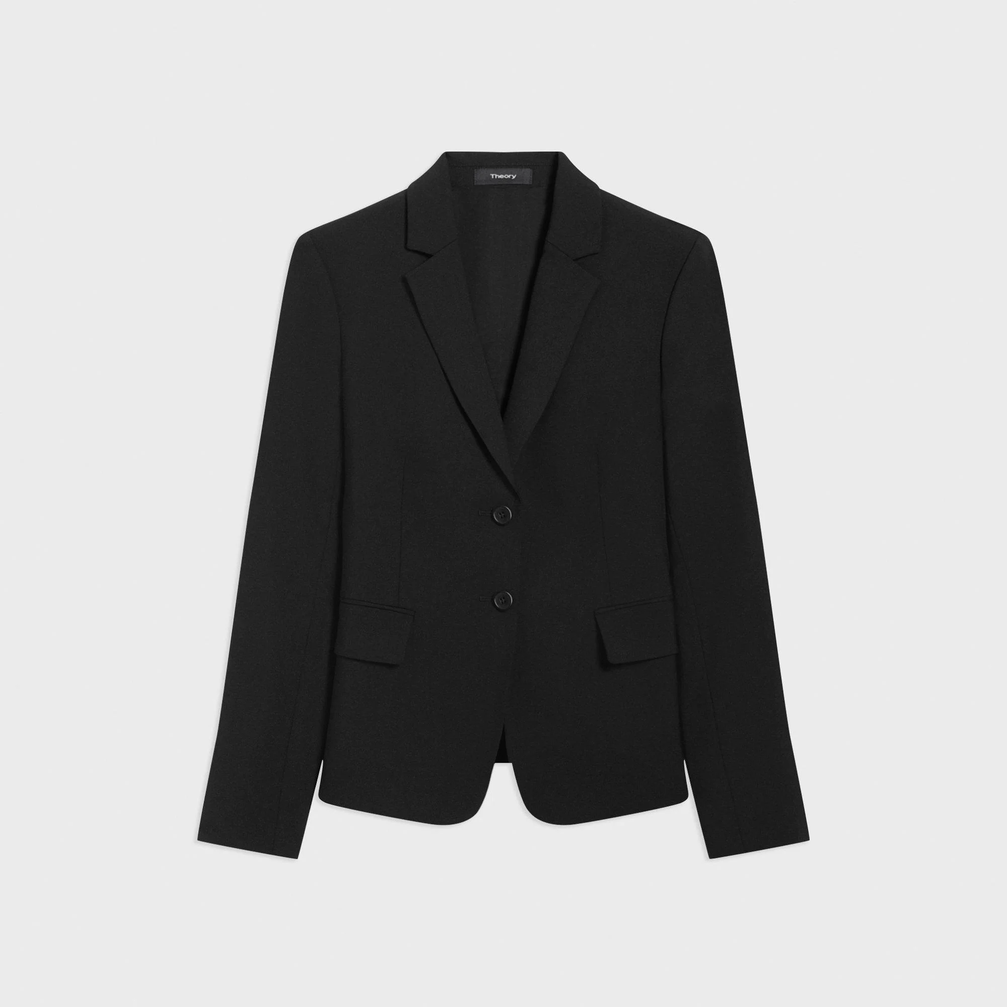 Combining classic menswear details with a refined feminine fit, our Carissa blazer is a two-button silhouette featuring structured shoulders and a darted front. Designed in a slim silhouette, this jacket is detailed with notch lapels, flap pockets, buttoned cuffs, and finished with a soft cupro lining woven with waste cotton fibers. It's tailored in our signature stretch Good Wool. Theory for Good We are committed to making a positive impact on the people who wear our clothes, our industry, and our planet, beginning with our Good fabrics. Consciously manufactured from start to finish, our Good Wool is crafted with premium merino wool. It’s sourced from farms in Australia, including the Beaufront farm in Tasmania and woven by the Tollegno 1900 mill in Biella, Italy. Learn more about our Good Wool. Style #: I0301199 Fit True to size, choose your normal size Slim fit, long sleeves Hip length Model is 5’11” and wearing a US size 2 Materials & Care Composition 96% wool 4% elastane Care Do not wash. Do not bleach. Do not tumble dry. Cool iron if needed. Dry clean with any solvent except trichloroethylene. Imported