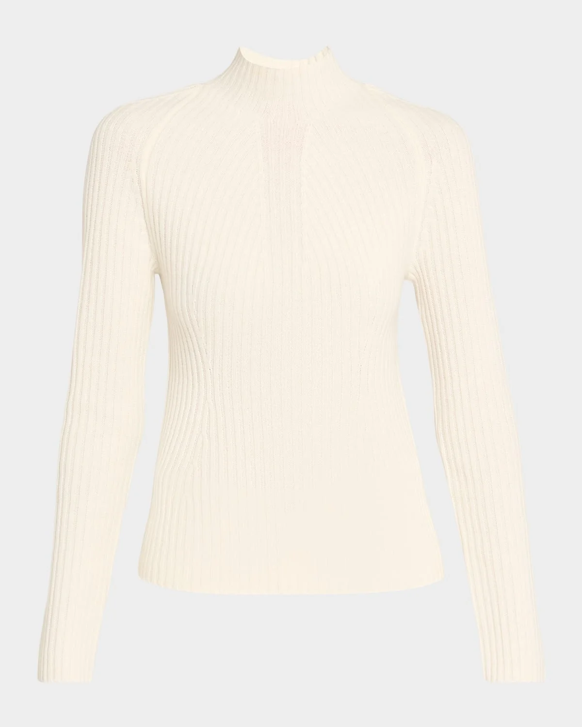 Ribbed luxurious cashmere sweater by Theory. Mock neckline Long raglan sleeves Slim fit Hem sits at the hip Pullover style Cashmere Dry clean Imported