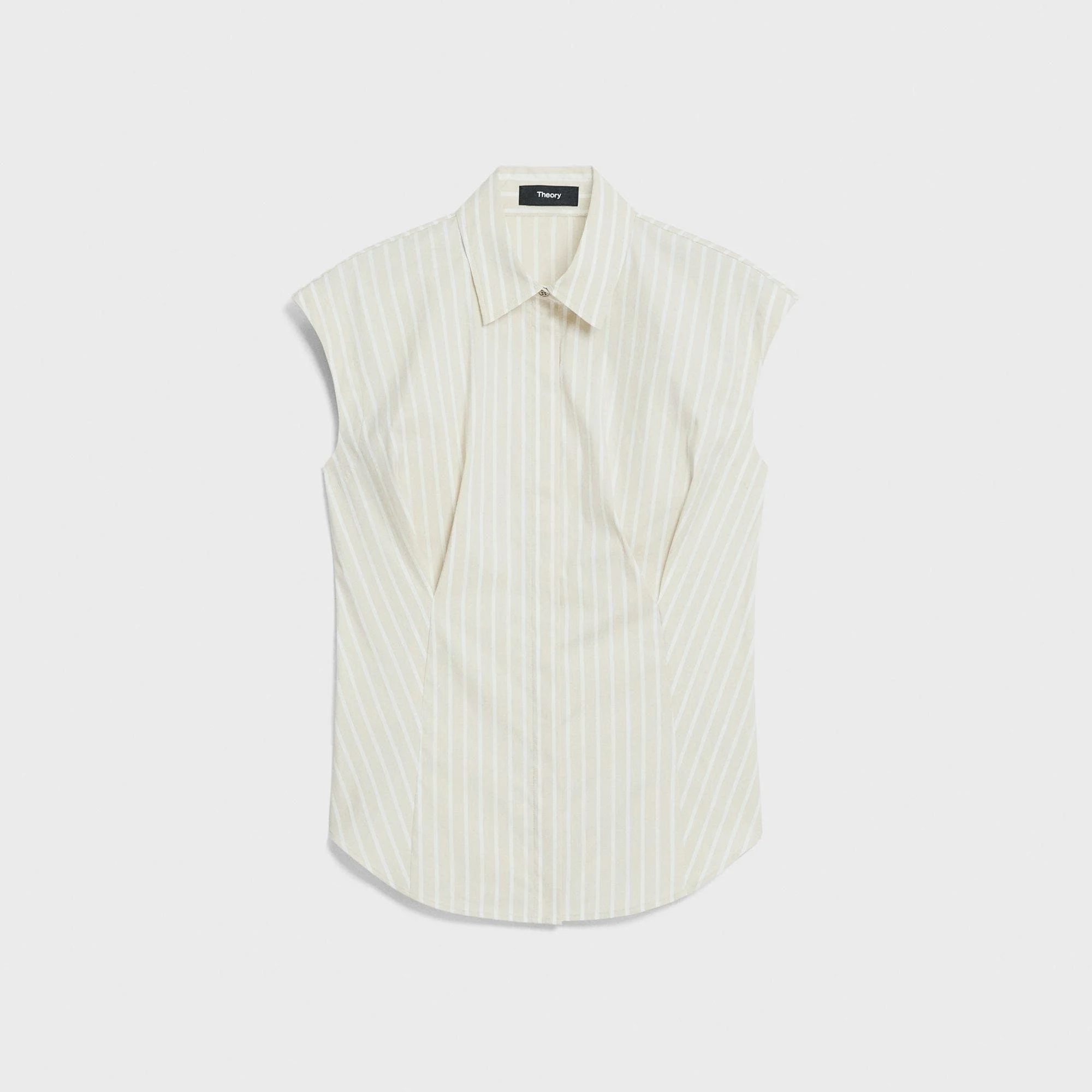Please enter your email below to be notified when this item is in stock Punctuated with a pointed collar, this button-up shirt is finished with a curved hem and cinched at the waist for a slim fit. This style features a seasonal stripe custom developed on a stretch cotton nylon base. Style #: P0304513 Please enter your email below to be notified when this item is in stock Fit True to size, choose your normal size Slim fit, cap sleeves Hip length Model is 5’11” and wearing a US size S Materials & Care Composition 75% cotton 22% nylon 3% spandex Care Do not wash. Do not bleach. Do not tumble dry. Cool iron if needed. Dry clean with any solvent except trichloroethylene. Imported