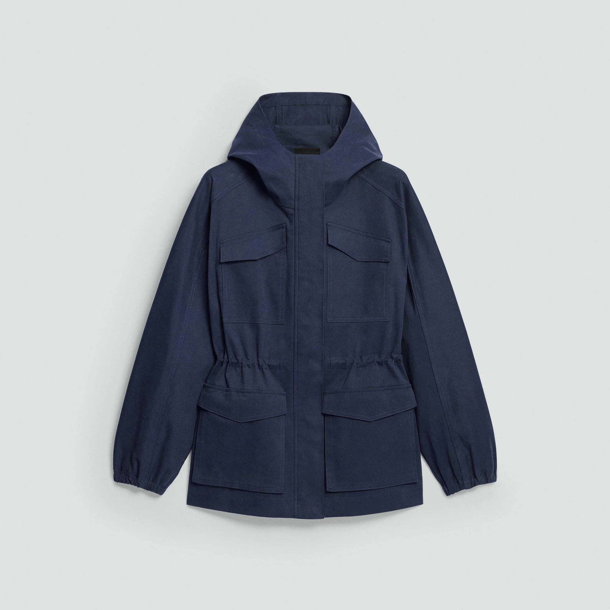 Please enter your email below to be notified when this item is in stock Defined with a cinched waist, this hooded windbreaker is designed in a relaxed fit. It’s a functional layer with oversized flap pockets, finished with a front zip and snap closures. Produced by a leading Italian cotton mill, the fabric has a soft hand and added stretch for exceptional comfort and utility. Style #: P0804402 Please enter your email below to be notified when this item is in stock Fit True to size, choose your normal size Oversized fit, long sleeves Hip length Model is 5’11” and wearing a US size S Materials & Care Composition 97% cotton 3% elastane Care Do not wash. Do not bleach. Do not tumble dry. Cool iron if needed. Dry clean with any solvent except trichloroethylene. Imported