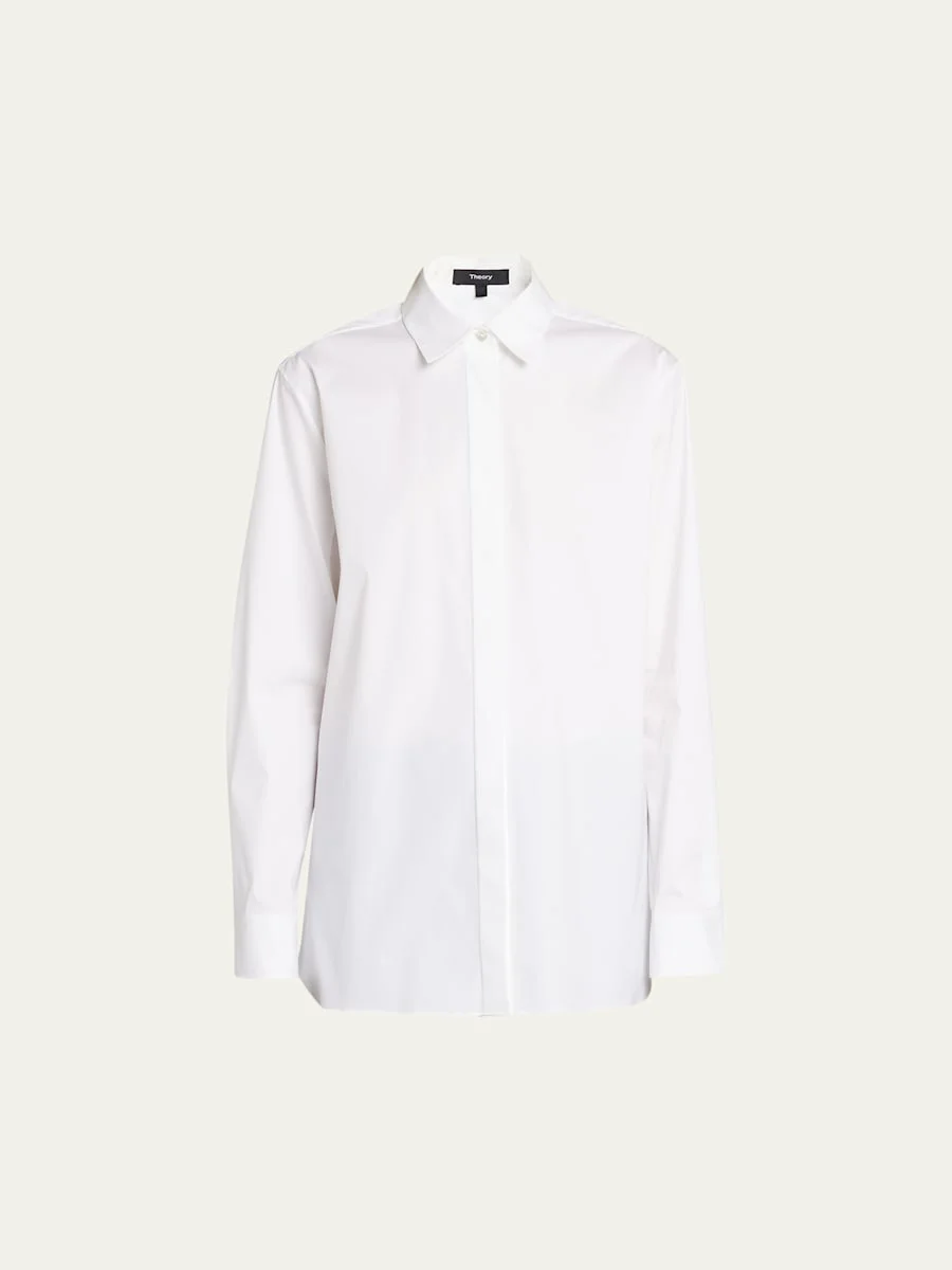 Theory classic menswear-inspired shirt with dropped shoulders Point collar; hidden button placket Long sleeves; button cuffs Yoked back Oversized fit Hits below hips Shirttail hem Cotton/nylon/Lycra® spandex Imported Model is 5'10"/177cm. Online Inquiries: BGS21_T4D4V| Store Inquiries: #4468977