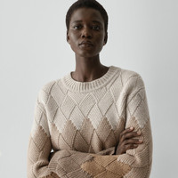 Please enter your email below to be notified when this item is in stock An intricate diamond weave pattern defines this crewneck sweater. It features dropped shoulders and a straight hem in a comfortable, relaxed fit. Finished with a ribbed trim, this pullover style is knit in a wool-cashmere blend with wool that is sourced from certified responsibly managed farms. It has a felted rib texture that has a luxurious look and an incredibly soft feel. Style #: P1111704 Please enter your email below to be notified when this item is in stock Fit True to size, choose your normal size Regular length Materials & Care Composition 90% wool 10% cashmere; exclusive of elastic Care Do not wash. Do not bleach. Do not tumble dry. Cool iron if needed. Dry clean with any solvent except trichloroethylene. Imported
