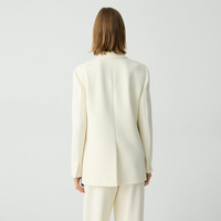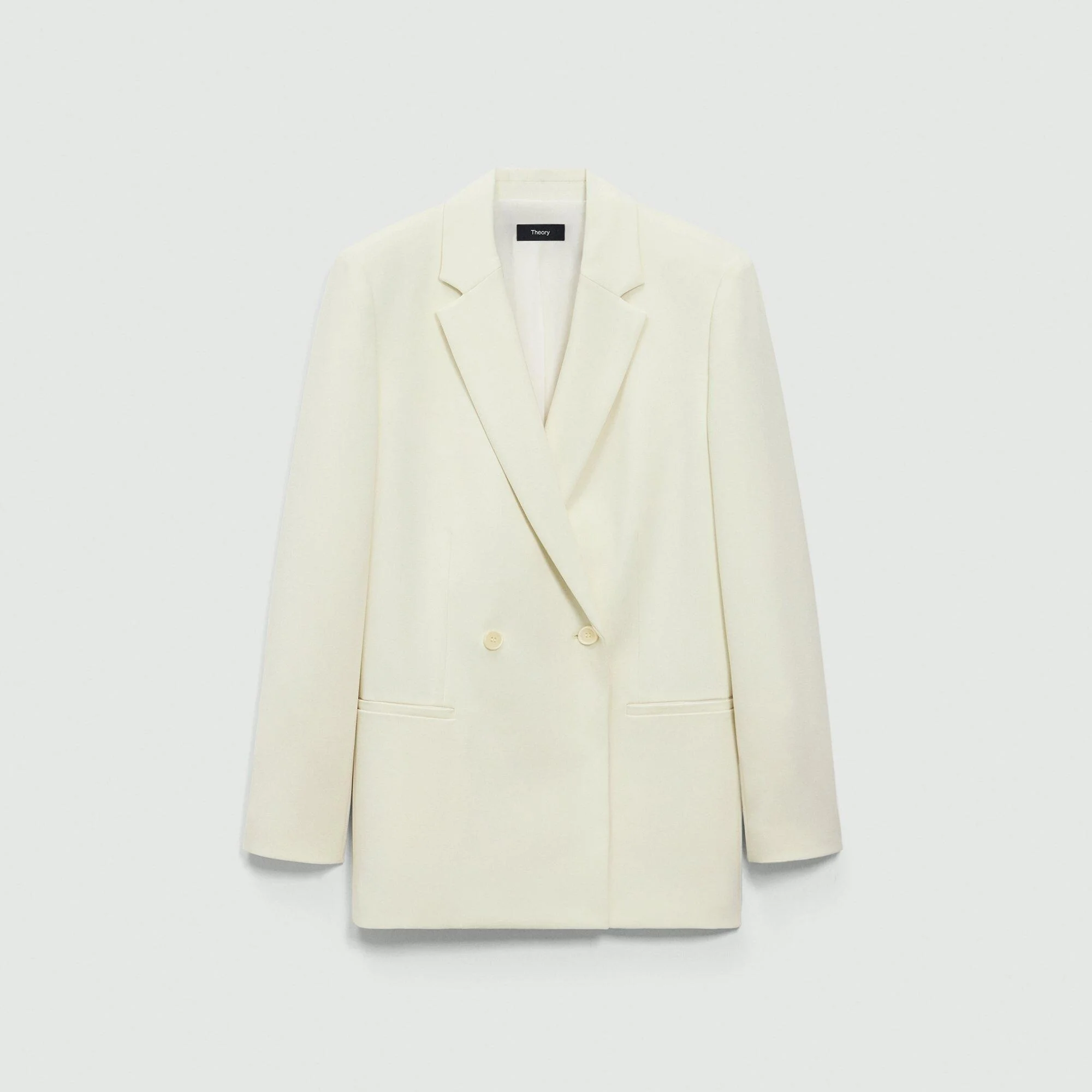 Cut for a relaxed fit, this blazer is punctuated with notched lapels, welt pockets, and a double-breasted front. It is made from our signature Japanese Admiral Crepe for a smooth and softly draped fit that maintains a polished appearance. Our signature crepe is woven with triacetate, a fabric made of wood pulp sourced from certified responsibly managed forests. Style #: P0109115 Fit Runs large, we recommended sizing down for a more tailored fit Relaxed fit, long sleeves Hip length Model is 5’11” and wearing a US size 2 Materials & Care Composition 70% triacetate 30% polyester Care Do not wash. Do not bleach. Do not tumble dry. Cool iron if needed. Dry clean with any solvent except trichloroethylene. Imported