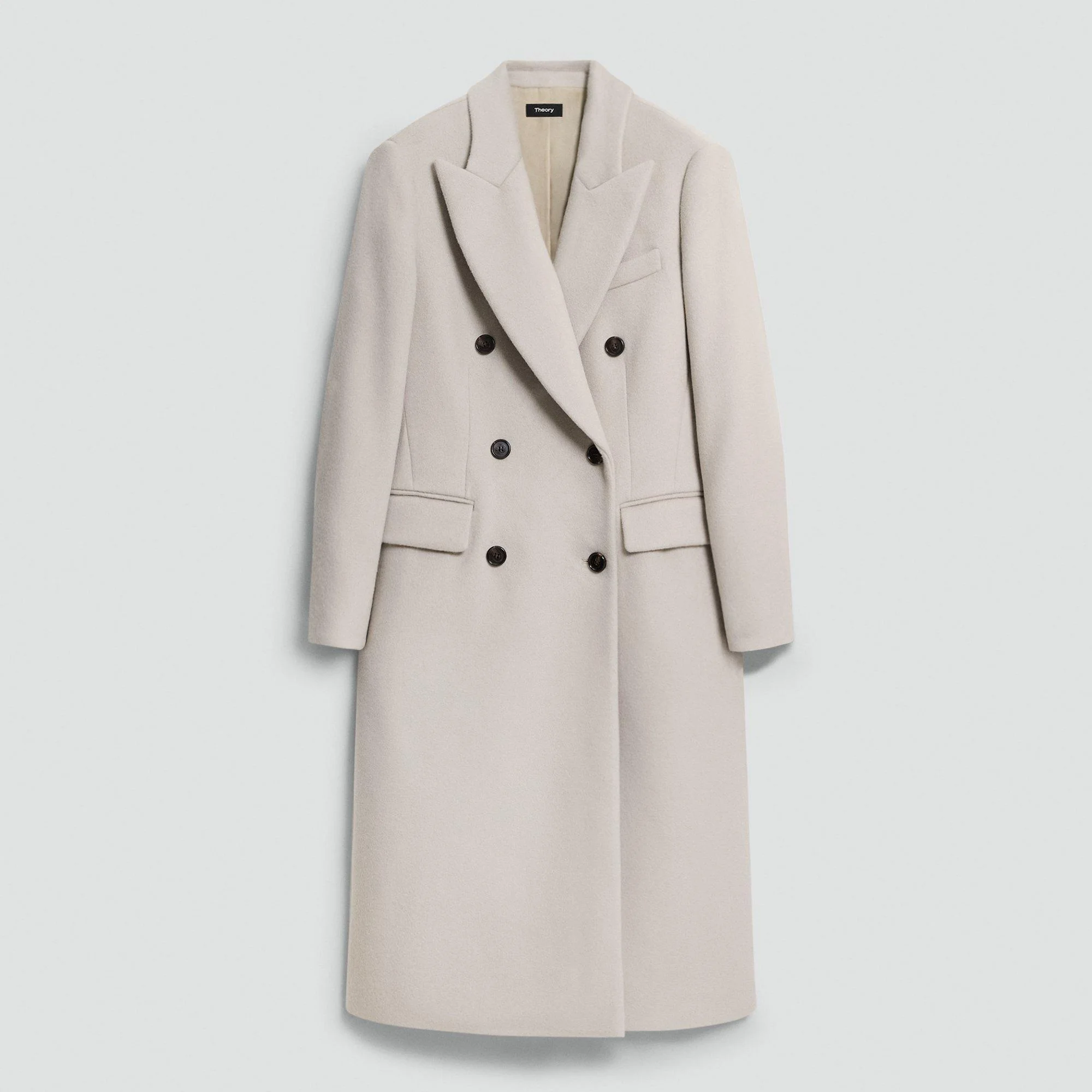 Please enter your email below to be notified when this item is in stock This double-breasted coat is tailored with peak lapels, a longline silhouette, and flap pockets. Designed with an oversized fit, it layers easily over knits or tailoring while maintaining a sharp structured shape. It’s crafted using plush wool sourced from certified responsibly managed farms and certified recycled polyamide made from pre-consumer waste. Style #: P0901413 Please enter your email below to be notified when this item is in stock Fit True to size, choose your normal size Oversized fit, long sleeves Long length Model is 5’11” and wearing a US size S Materials & Care Composition 72% virgin wool 23% polyamide 5% cashmere Care Do not wash. Do not bleach. Do not tumble dry. Cool iron if needed. Dry clean with any solvent except trichloroethylene. Imported