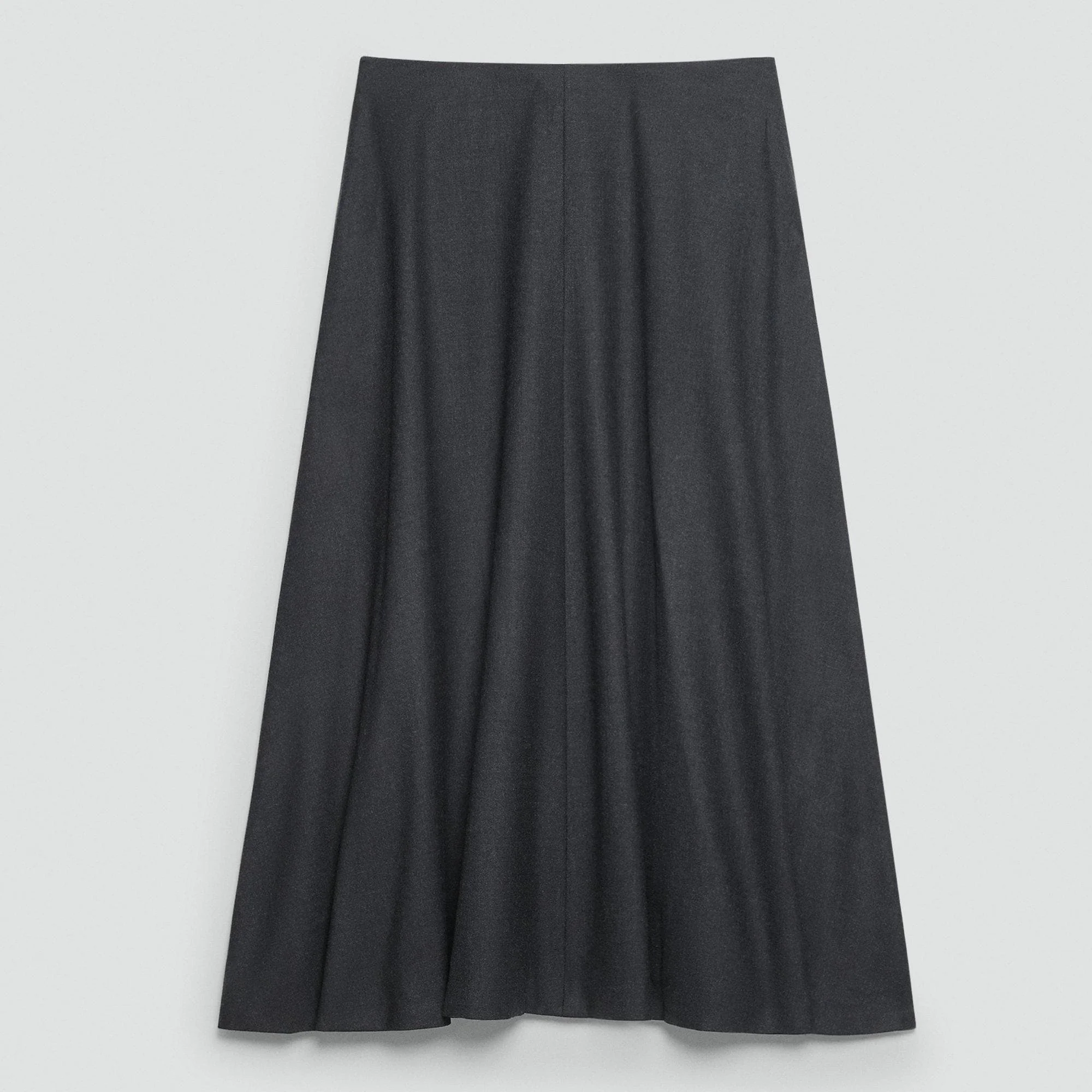 Please enter your email below to be notified when this item is in stock Clean lines meet subtle volume in this full-circle midi skirt, shaped with a structured waistband, angled seams, and a fluid drape. A concealed zip for a smooth profile. Cut in a wool-blend flannel with a smooth, resilient finish, the style is made using certified responsibly sourced wool from ethically run farms and recycled polyester. Pairs effortlessly with a tailored jacket or fitted knit. Style #: P0801310 Please enter your email below to be notified when this item is in stock Fit True to size, choose your normal size High rise, flared silhouette Midi length Model is 5’11” and wearing a US size 2 Materials & Care Composition 40% wool 29% polyester 28% viscose 3% spandex Care Do not wash. Do not bleach. Do not tumble dry. Cool iron if needed. Dry clean with any solvent except trichloroethylene. Imported