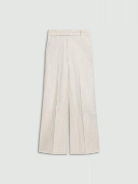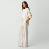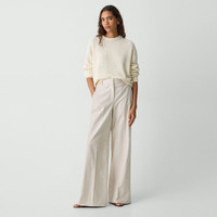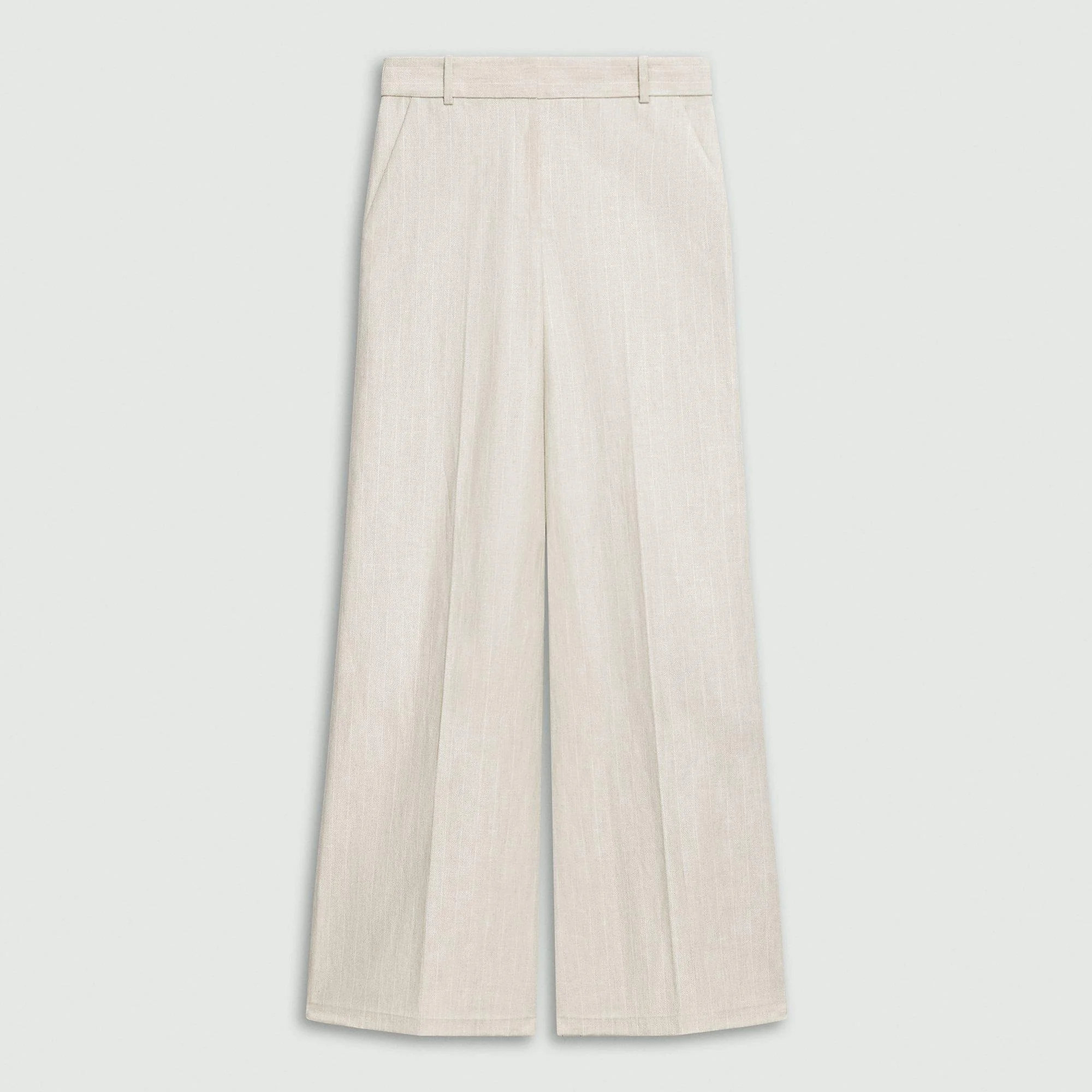 Please enter your email below to be notified when this item is in stock With a pressed front and a zip closure, this high-waist, wide-leg trouser is crafted of a certified European sourced linen blended with cotton into canvas. It’s made by a leading Italian mill with textured yarns and a subtle stripe pattern to add visual interest. Style #: P0304206 Please enter your email below to be notified when this item is in stock Fit True to size, choose your normal size High rise, wide leg Full length Model is 5’11” and wearing a US size 2 Materials & Care Composition 77% cotton 21% linen 2% elastane Care Do not wash. Do not bleach. Do not tumble dry. Cool iron if needed. Dry clean with any solvent except trichloroethylene. Imported