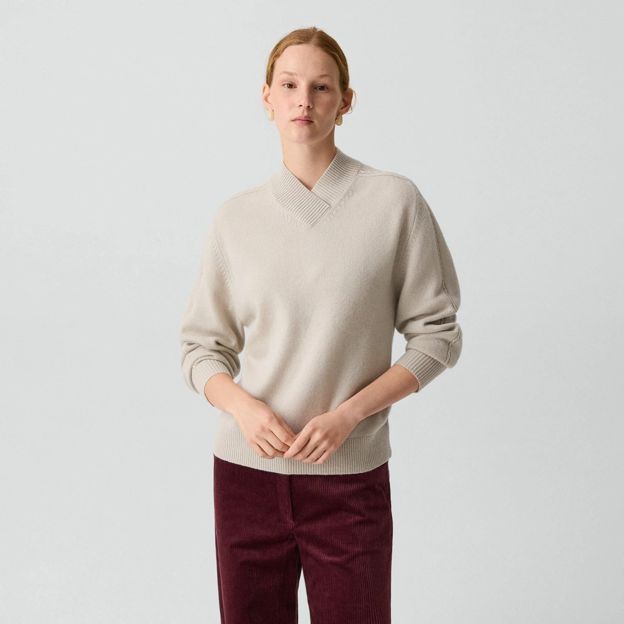 Please enter your email below to be notified when this item is in stock This pullover sweater is framed by a crossover V-neckline and long raglan sleeves for a softly structured silhouette. Designed for versatility, it can be styled under tailoring or paired with your favorite denim. It’s knit in pure featherweight cashmere, sourced from a premier cashmere mill, with an exceptionally soft hand feel while offering enduring warmth. Crafted in our classic single-ply cashmere with an ultra-soft feel. Style #: P1018701 Please enter your email below to be notified when this item is in stock Fit True to size, choose your normal size Relaxed fit, long sleeves Regular length Model is 5’11” and wearing a US size S Materials & Care Composition 100% cashmere Care Do not wash. Do not bleach. Do not tumble dry. Cool iron if needed. Dry clean with any solvent except trichloroethylene. Imported