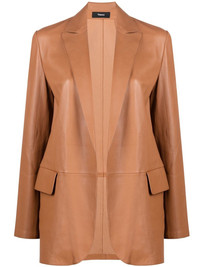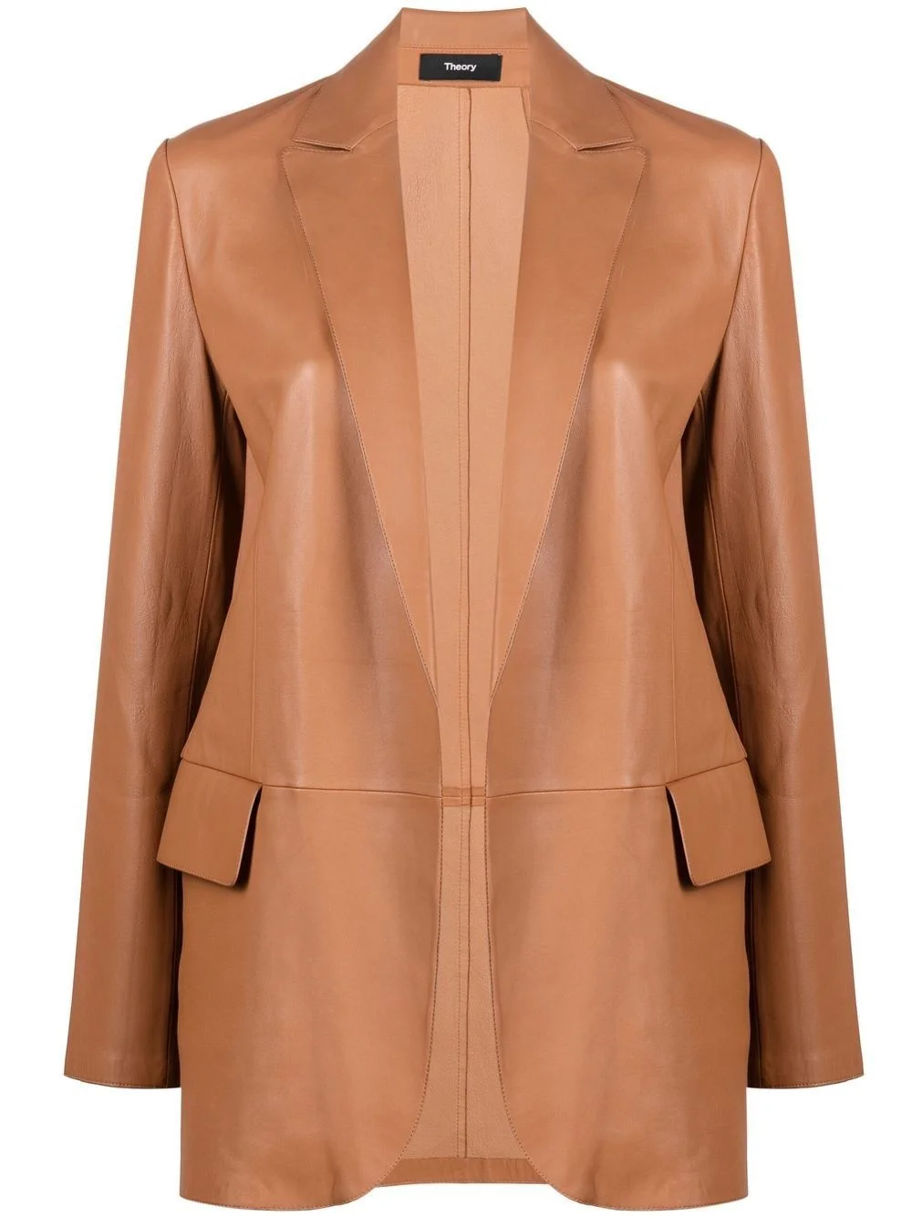 leather open front blazer brown lambskin classic lapels open front long sleeves two side flap pockets Imported Composition Lining: Polyester 100% Outer: Lamb Skin 100% SIZE & FIT Model measurements Height 5 ft 10 in(1.77 m) Bust/Chest 29.92 in(76 cm) Hips 34.25 in(87 cm) Waist 23.62 in(60 cm) Measurement SLEEVE LENGTH 23.22 in(59 cm) LENGTH 28.34 in(72 cm) WAIST 41.73 in(106 cm) BUST 40.94 in(104 cm) FittingInformation This piece fits true to size. We recommend you get your regular size Cut for a loose fit Made with a mid-weight non-stretch fabric
