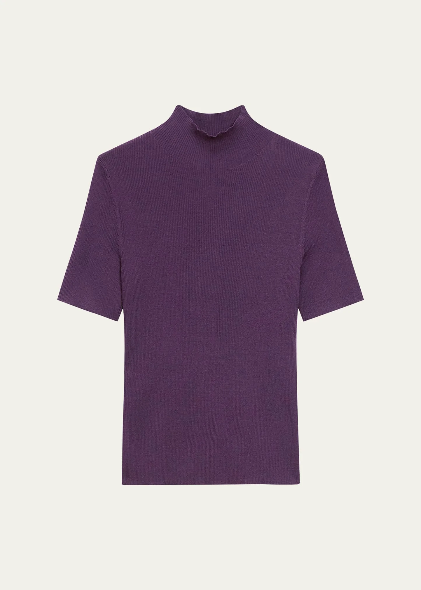 Theory "Leenda" classic knit top in a 2x2 feeder stripe Mock neckline Short sleeves Hip length Fitted Pullover style Merino wool Dry clean Imported Online Inquiries: BGS21_T5Z0W| Store Inquiries: #4862580