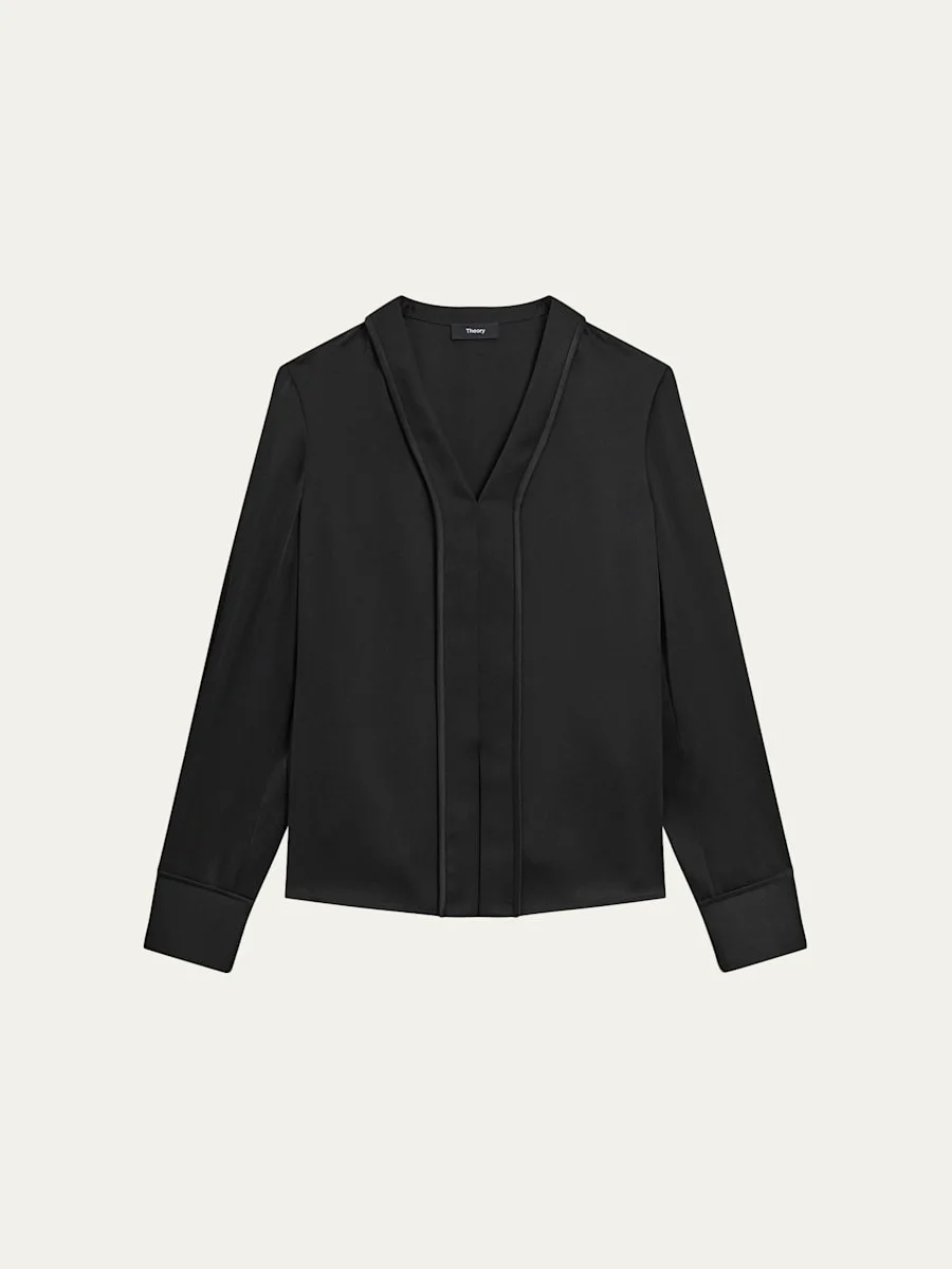 Luxe satin blouse finished with a binding detail by Theory. V neckline Long sleeves with button cuffs Straight fit Hem falls to the hip Pullover style Triacetate/polyester Dry clean Imported