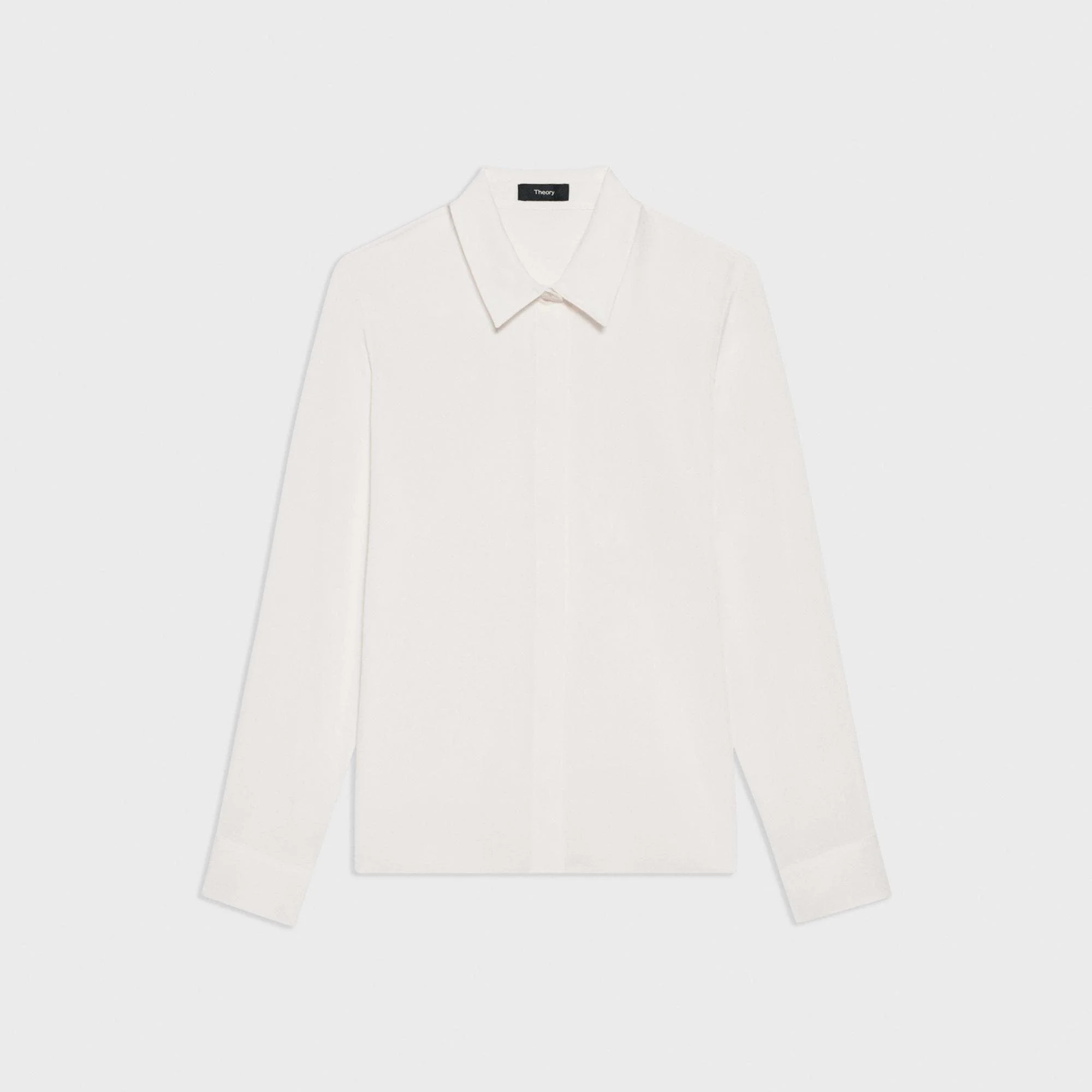 Our classic fitted shirt is tailored in a polished, feminine shape that can be worn alone or under a blazer. It’s detailed with a hidden button placket, adjustable cuffs, mother-of-pearl buttons, and a rounded hem. Crafted with our lightweight, breathable silk georgette with an elegant drape that’s easy to style all year round. Our silk georgette is MADE IN GREEN by OEKO-TEX® certified. All products with this certification are made without harmful chemicals, in environmentally and socially responsible facilities. Each component of the garment, the factory, and the mill have been certified by OEKO-TEX®. Style #: M0102536 Fit Runs slim, choose one size larger than normal Slim fit, long sleeves Hip length Model is 5’11” and wearing a US size S Materials & Care Composition 100% silk Care Do not wash. Do not bleach. Do not tumble dry. Cool iron if needed. Dry clean with any solvent except trichloroethylene. Imported