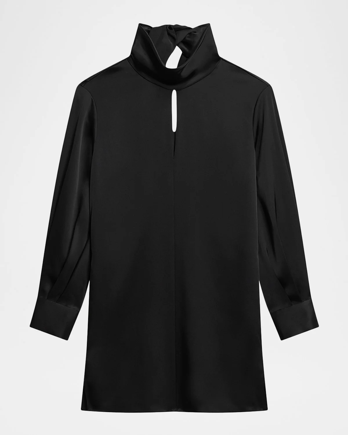 Luxe satin dress adorned with a tie back by Theory. High neckline; keyhole cutout Long blouson sleeves with button cuffs Shift silhouette Hem falls above the knee Triacetate/polyester Dry clean Imported