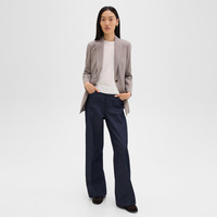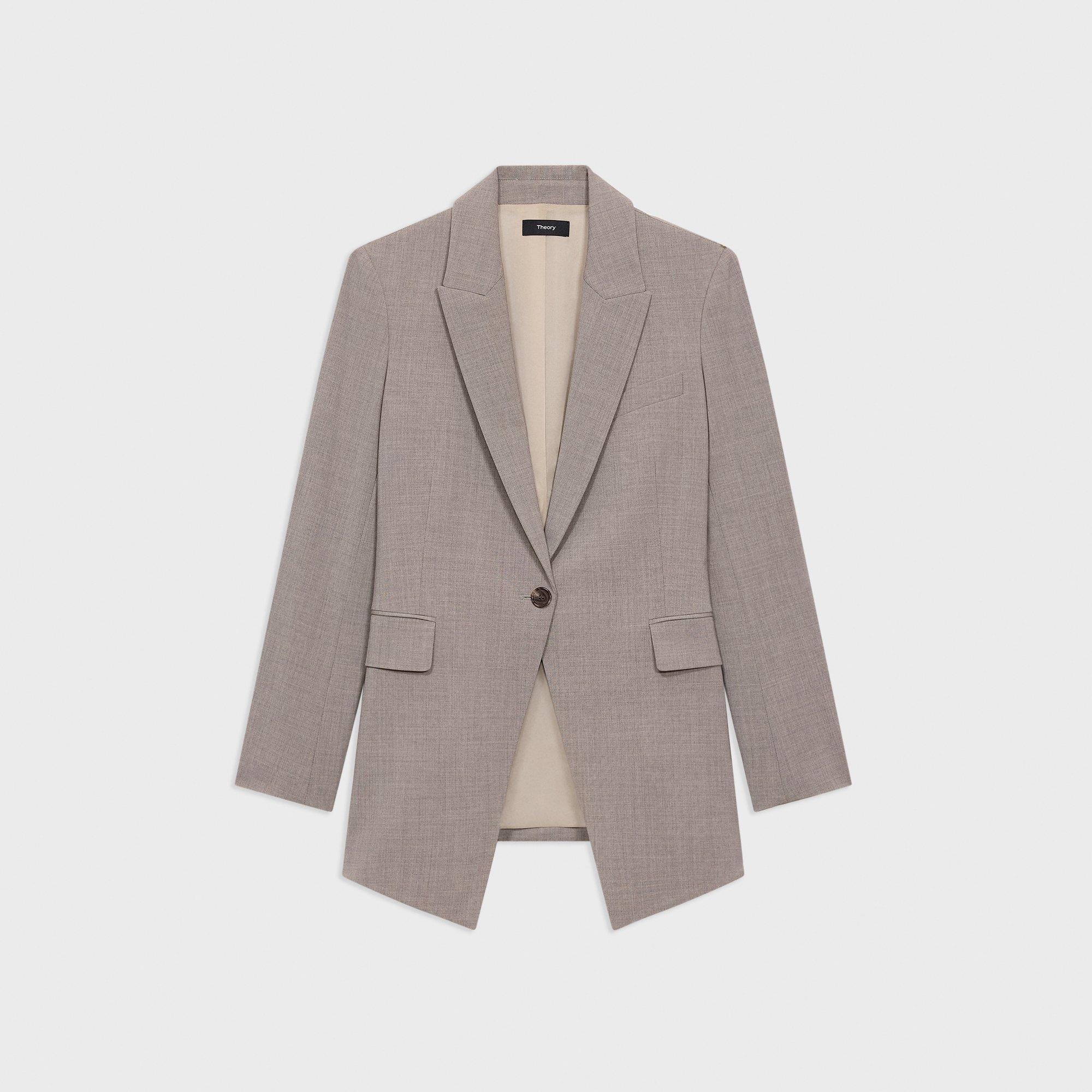 Our Etiennette blazer goes from day to night in a strong, feminine silhouette featuring peak lapels, a cutaway front, and flattering nipped-in waist. Fully lined in cupro made with waste cotton fibers, this power jacket can be styled as a suit or dressed down with a T-shirt and jeans. Theory for Good We are committed to making a positive impact on the people who wear our clothes, our industry, and our planet, beginning with our Good fabrics. Consciously manufactured from start to finish, our Good Wool is crafted with premium merino wool. It’s sourced from farms in Australia, including the Beaufront farm in Tasmania and woven by the Tollegno 1900 mill in Biella, Italy. Learn more about our Good Wool. Style #: H0101113 Fit True to size, choose your normal size Fitted through the waist, bracelet length sleeves Below hip length Model is 5’11” and wearing a US size 2 Materials & Care Composition 96% wool 4% elastane Care Do not wash. Do not bleach. Do not tumble dry. Cool iron if needed. Dry clean with any solvent except trichloroethylene. Imported