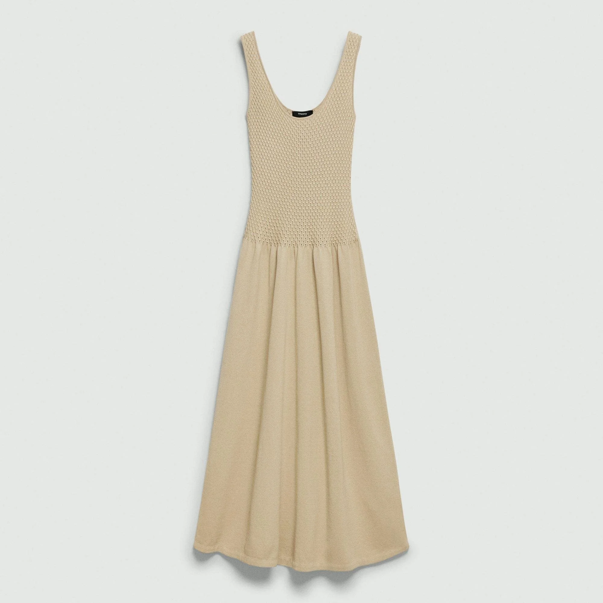 Please enter your email below to be notified when this item is in stock A breathable and romantic silhouette, this midi style features a fitted bodice with fine texture that meets a flared skirt from a pull-on waistline. The fabric is crafted from a fine, ultra-light blend of Pima cotton and nylon produced by a leading Japanese mill. Style #: P0314704 Please enter your email below to be notified when this item is in stock Fit True to size, choose your normal size Fit-and-flare silhouette, sleeveless Below-the-knee length Model is 5’11” and wearing a US size S Materials & Care Composition 65% cotton 35% nylon Care Hand wash cold. Do not bleach. Lay flat to dry in shade, do not tumble dry. Cool iron if needed. Dry clean with any solvent except trichloroethylene. Imported