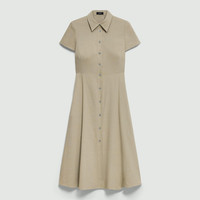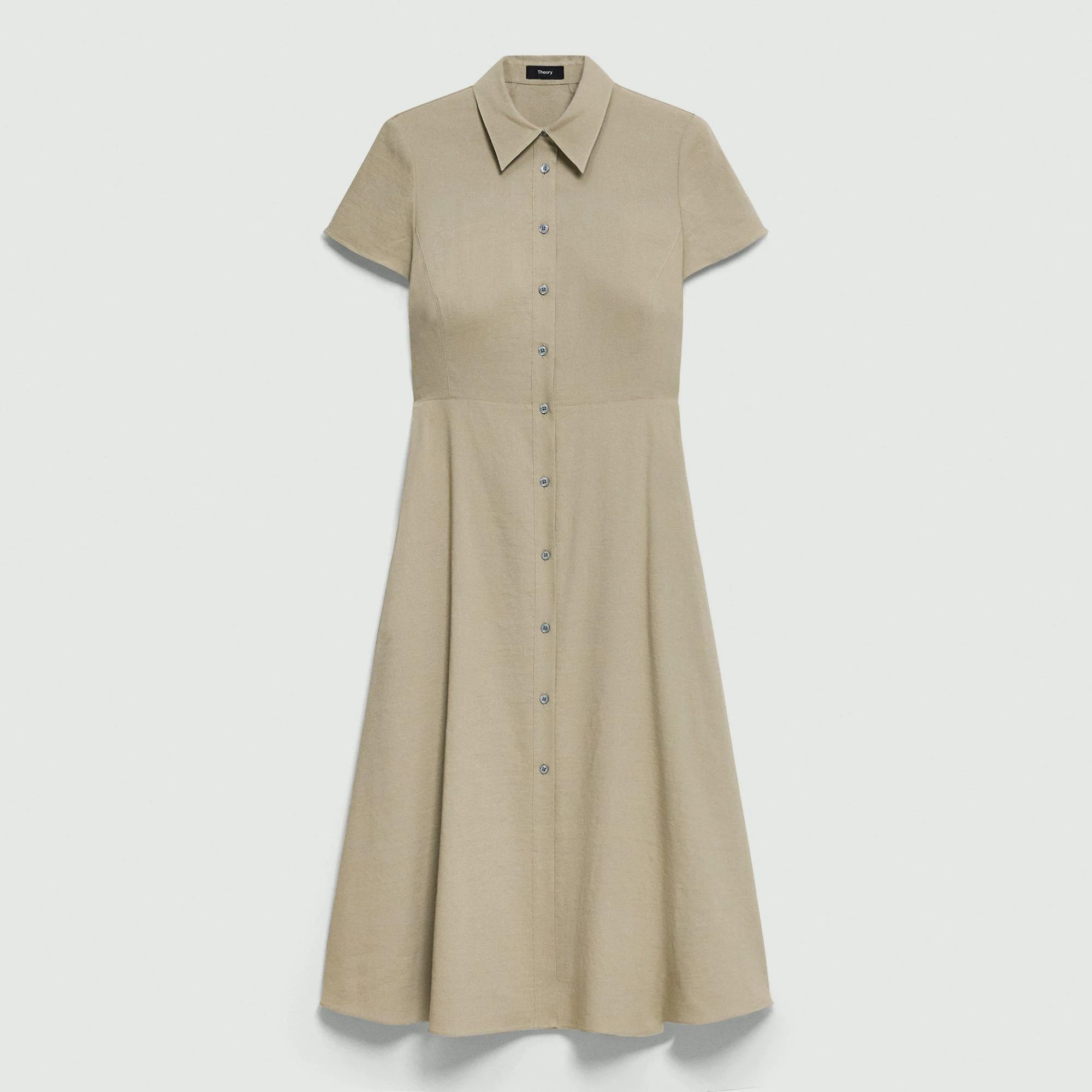Please enter your email below to be notified when this item is in stock Tailored to achieve a fit-and-flare silhouette, this midi dress is buttoned up the front to meet a pointed collar. Crafted from our signature stretch Good Linen fabric, this short-sleeve style is a warm-weather everyday favorite. Theory for Good We are committed to making a positive impact on the people who wear our clothes, our industry, and our planet, beginning with our Good Collection fabrics. Woven by the Marini & Cecconi Mill in Prato, Italy, Good Linen is our signature stretch linen fabric, made up of three fibers—flax sourced from France, viscose made from repurposed waste cotton fibers, and recycled elastane for stretch. Learn more about our Good Linen. Style #: O0203611 Please enter your email below to be notified when this item is in stock Fit True to size, choose your normal size Fit-and-flare silhouette, short sleeves Below-the-knee length Model is 5’11” and wearing a US size 2 Materials & Care Composition 62% linen 36% viscose 2% elastane Care Do not wash. Do not bleach. Do not tumble dry. Cool iron if needed. Dry clean with any solvent except trichloroethylene. Imported