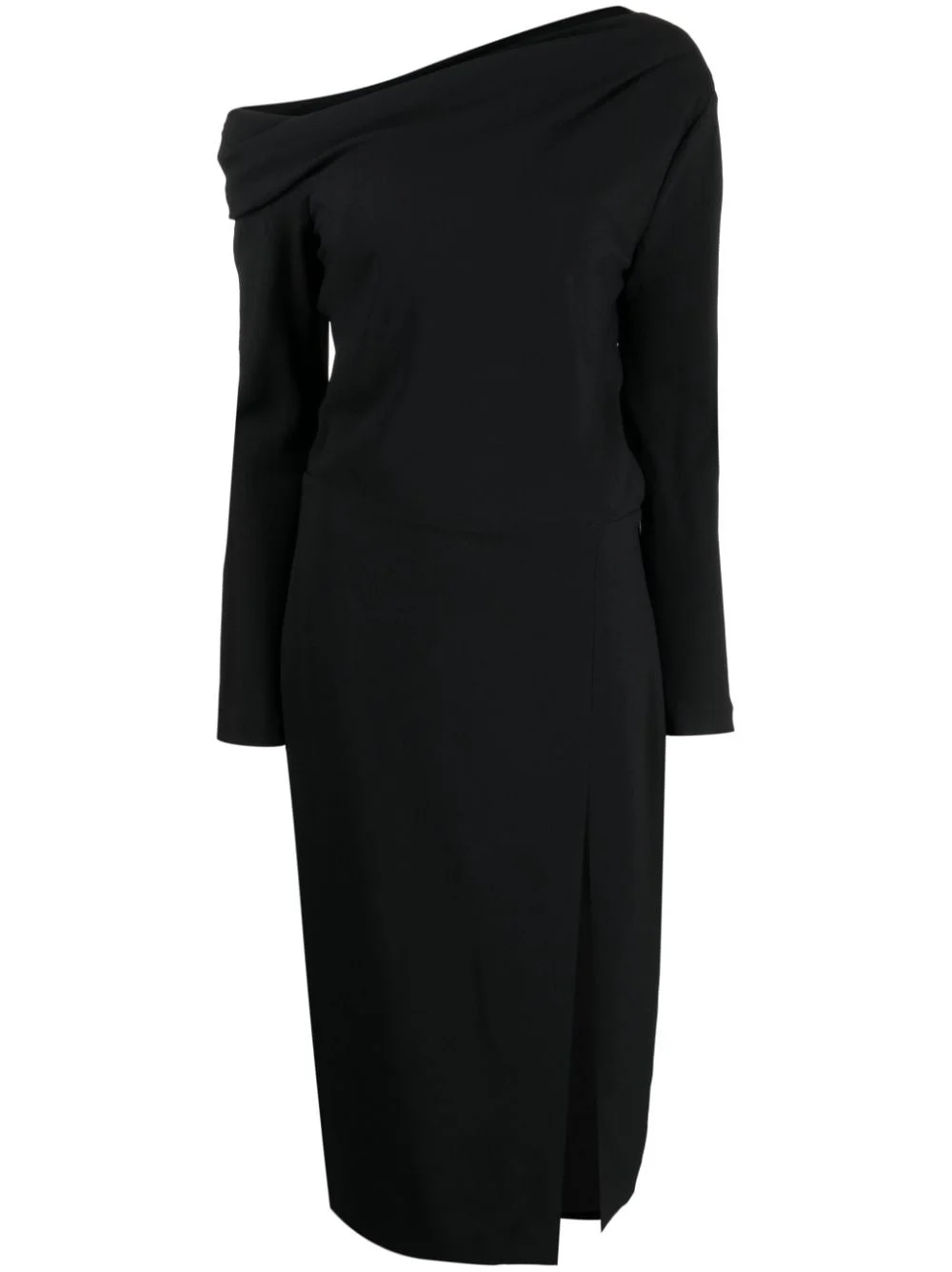 off-shoulder midi dress Leaning into minimalism, this black midi dress by Theory features an asymmetric off-shoulder design accentuated with a single side slit. Highlights - Black - Asymmetric design - Off-shoulder - Long sleeves - Below-knee length - Side slit Imported Composition Outer: Acetate 57%, Viscose 43% Lining: Polyester 100% SIZE & FIT Model measurements Height 5 ft 10 in(1.78 m) Bust/Chest 29.13 in(74 cm) Hips 35.43 in(90 cm) Waist 23.62 in(60 cm) FittingInformation Designed for a close fit at the chest and waist with a loose fit at the hip Made from a midweight non-stretch fabric This piece fits true to size – take your usual size Washing instructions Dry Clean Only