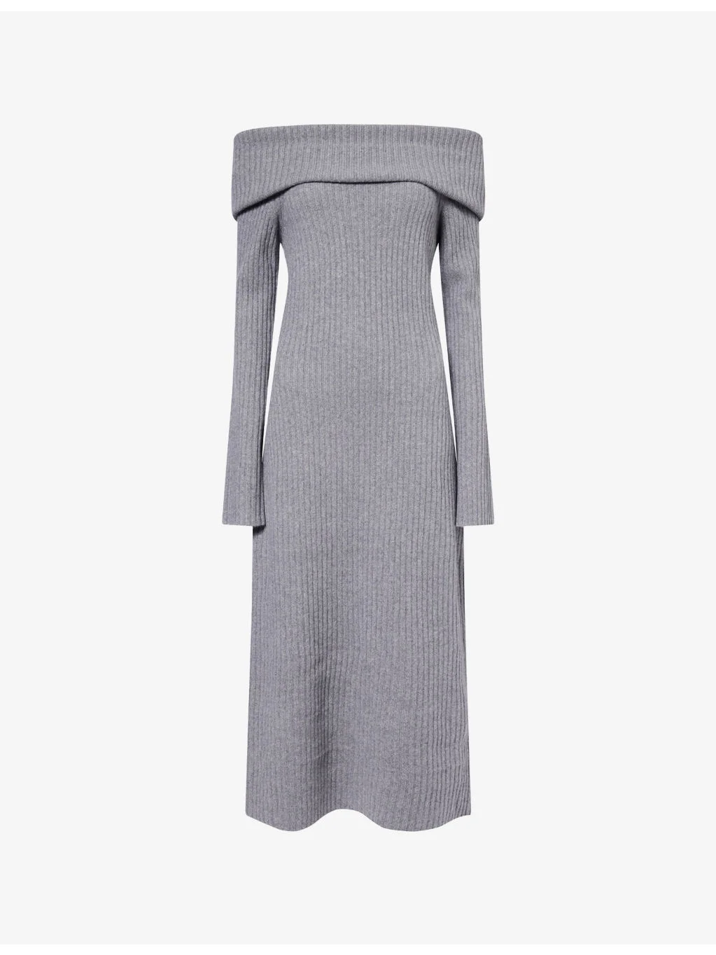 PRODUCT DETAILS - Theory wool and cashmere-blend midi dress - 90% wool, 10% cashmere - Regular fit, off-shoulder, long sleeves, all-over stretch-rib knit - Dry clean - True to size - Size small: length 50in / 127cm - Model is 5ft 10in/1.78m and wears a size small - Midweight, stretchy Ref: R04560727