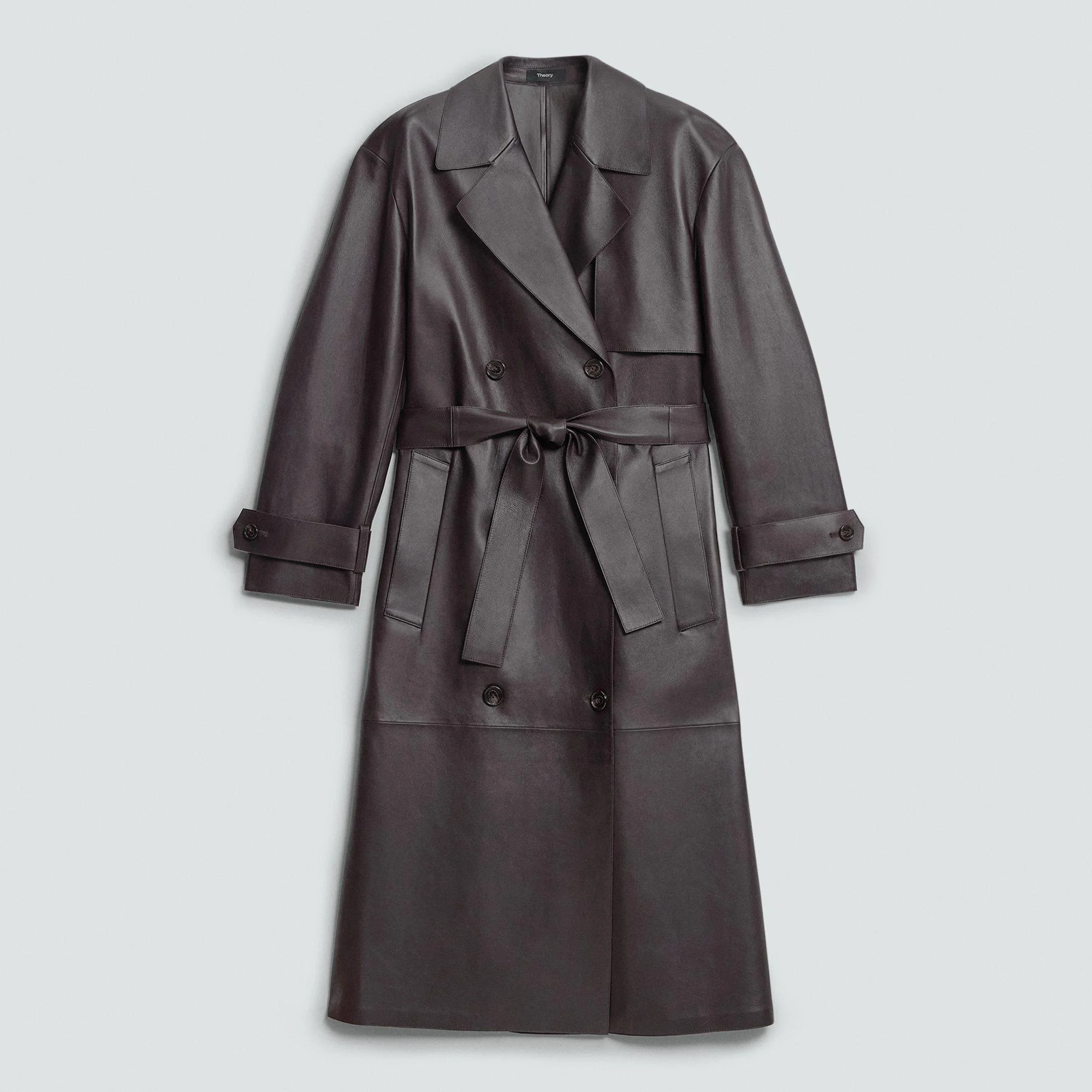 Please enter your email below to be notified when this item is in stock This belted trench coat reimagines a timeless style. It features sharp notch lapels, welt pockets, and a storm flap. Crafted in lamb leather with a smooth, supple finish, it’s a commanding layer that moves effortlessly from day to night. Style #: P0800411 Please enter your email below to be notified when this item is in stock Fit True to size, choose your normal size Oversized fit, long sleeves Long length Model is 5’11” and wearing a US size S Materials & Care Composition 100% lamb leather Care Do not wash. Do not bleach. Do not tumble dry. Do not iron. Do not dry clean. Professional leather clean only. Imported