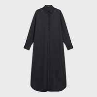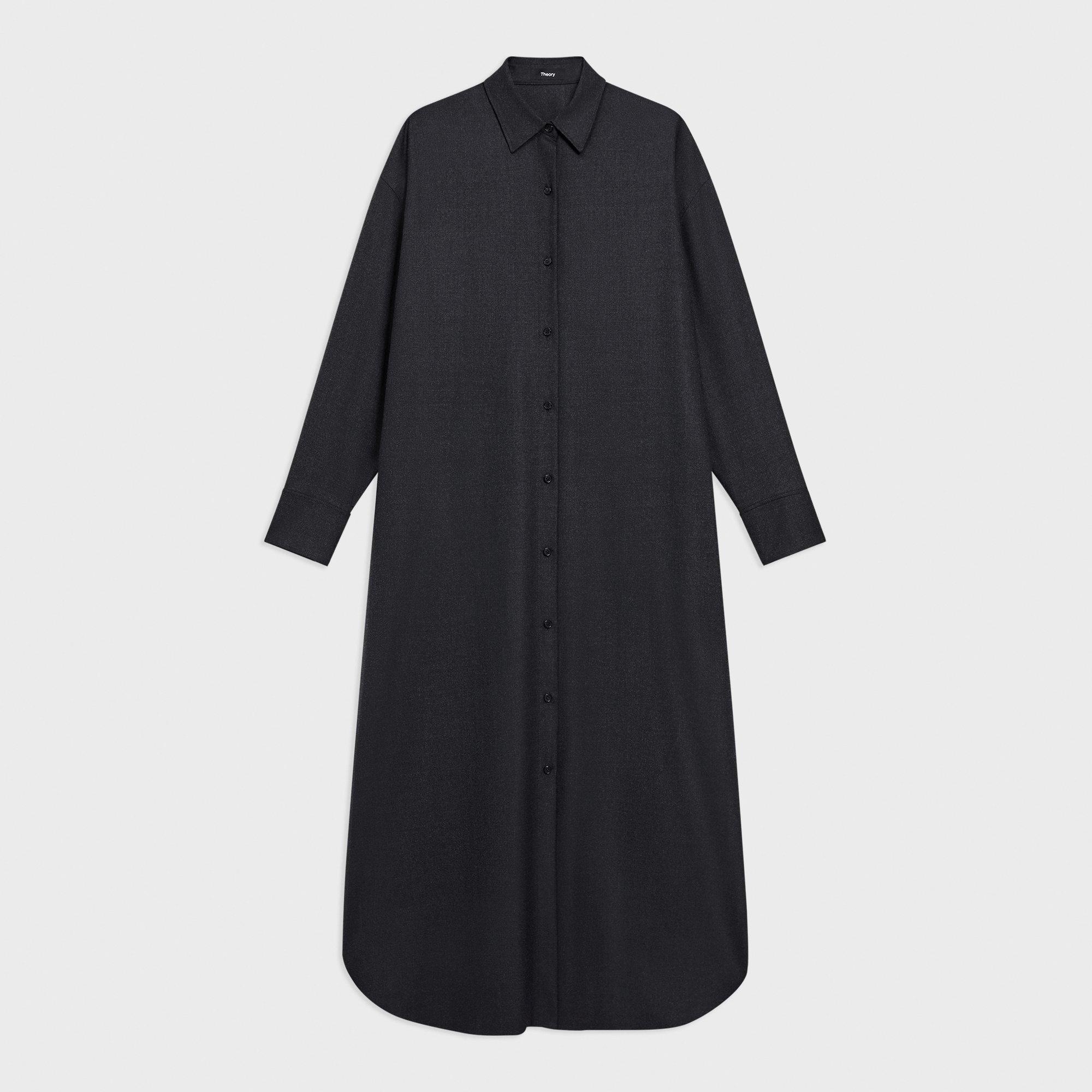 Our shirt dress is inspired by classic workwear—a pointed collar, buttoned front, on-seam pockets, and full-length shirttail hem. Effortlessly oversized for a laid-back, yet refined feel, this version is tailored in blended flannel that was designed in Italy and made using certified responsibly sourced wool from ethically run farms and recycled polyester. Style #: O0801609 Fit True to size, choose your normal size Oversized silhouette, long sleeves Full length Model is 5’11” and wearing a US size S Materials & Care Composition 40% wool 29% polyester 28% viscose 3% spandex Care Do not wash. Do not bleach. Do not tumble dry. Cool iron if needed. Dry clean with any solvent except trichloroethylene. Imported
