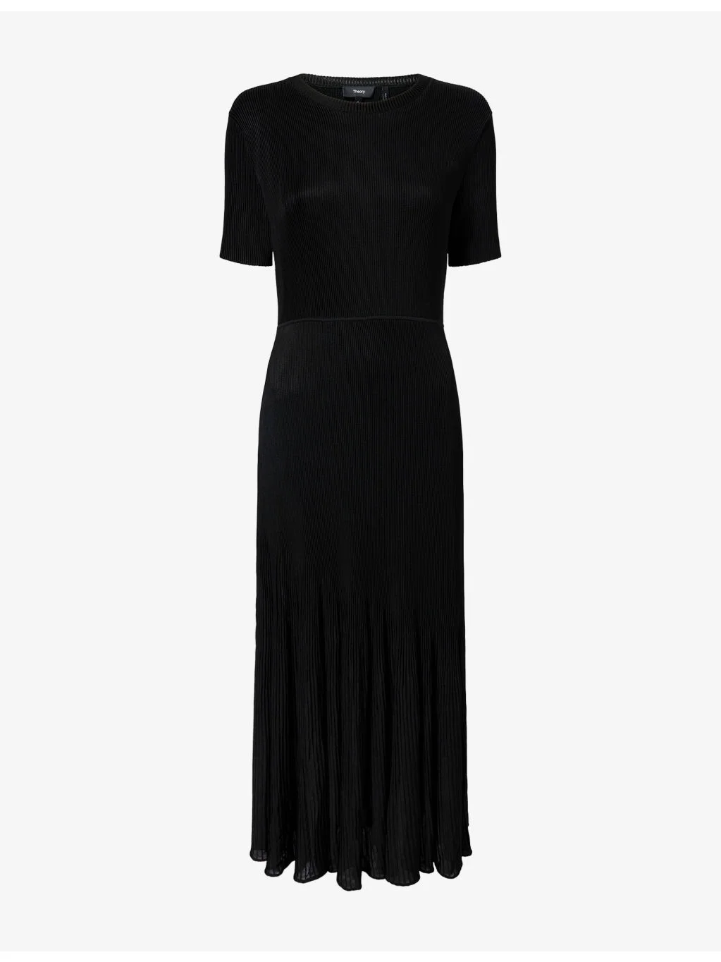 PRODUCT DETAILS - Theory stretch-woven midi dress - 94% rayon, 5% nylon, 1% elastane - Fitted, round neck, short sleeves, all-over stretch-rib knit. flared hem, unlined - Dry clean - True to size - Size small: length 47in / 119.3 - Model is 5ft 10in/1.78m and wears a size small - Midweight, stretchy Ref: R04560728