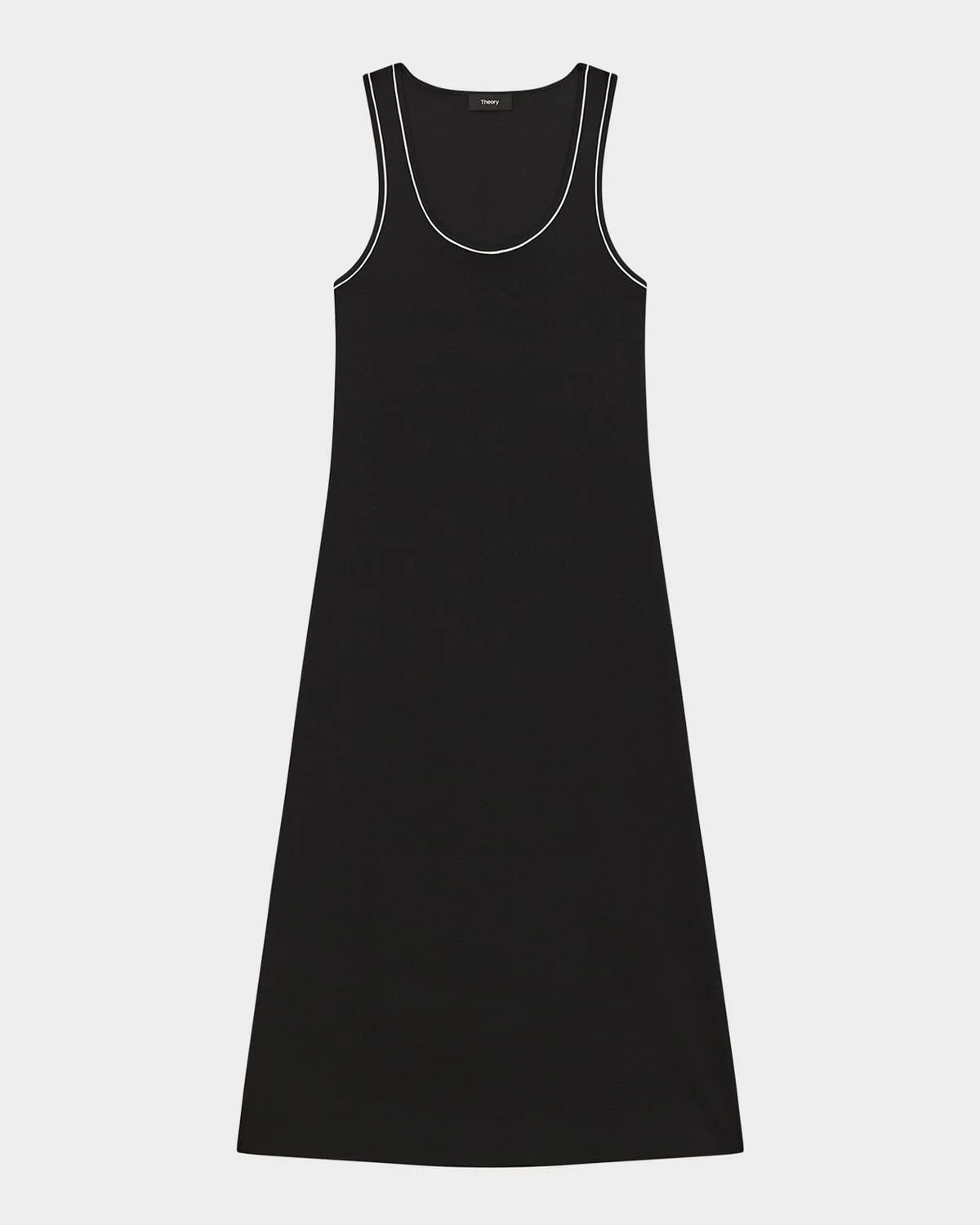 - A fitted sleeveless midi dress with an asymmetric draped shoulder and a vent opening at the wearer's left side seam. - Theory rib-knit tank dress finished with contrast piping - Scoop neckline - Sleeveless - Column silhouette - Hem falls below the knee - Slipover style - Pima cotton/spandex - Imported